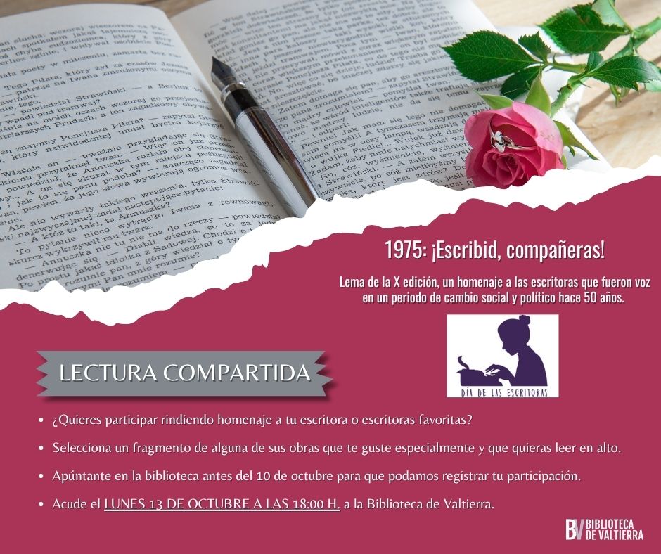 Cada participante seleccionará previamente una escritora de su gusto y un fragmento de una de sus obras. El 13 de octubre a las 18:00 horas nos reuniremos en la biblioteca para leer los textos en público.