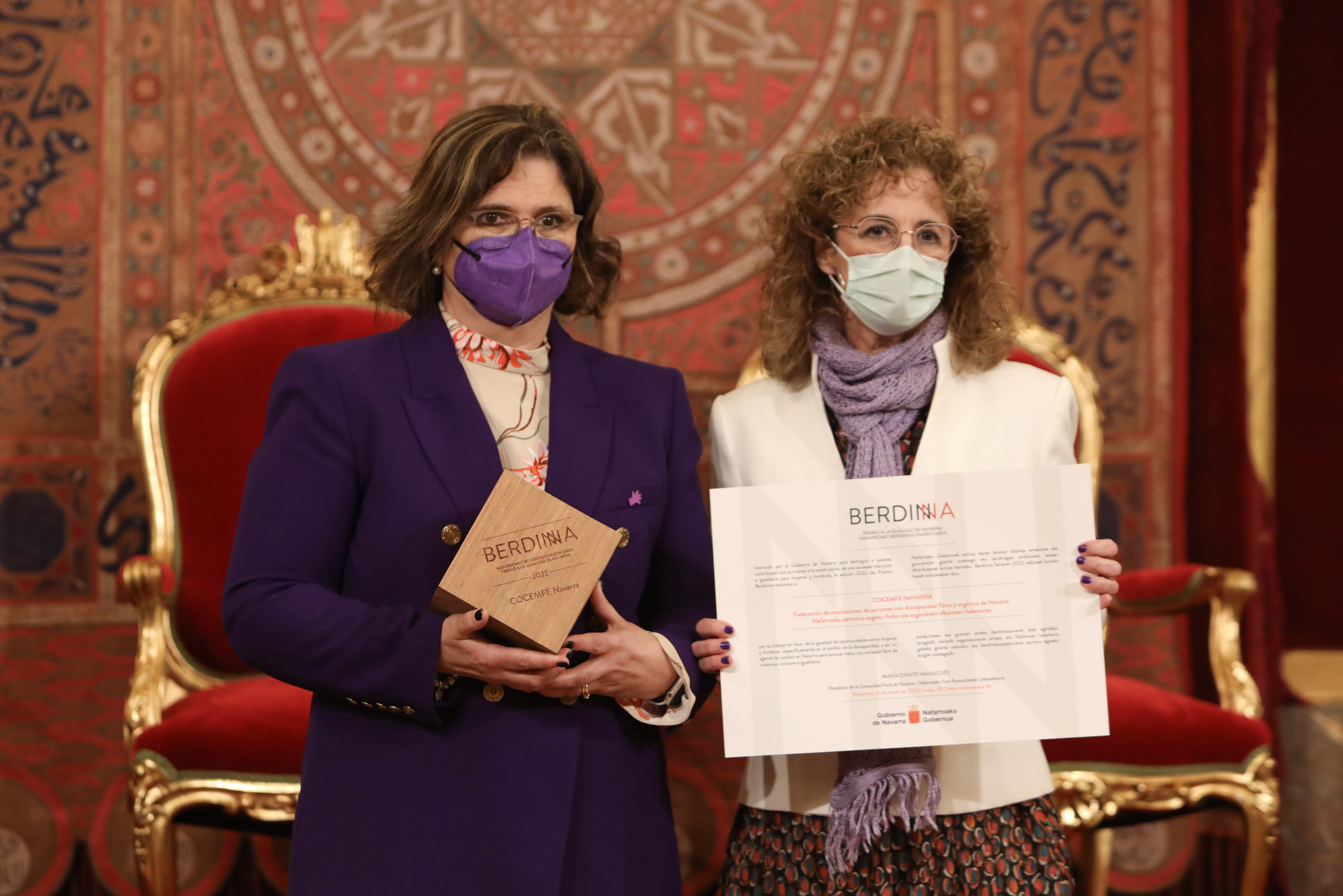 La Presidenta de Navarra, María Chivite, ha resaltado hoy martes “el compromiso con la igualdad de oportunidades entre mujeres y hombres” de COCEMFE Navarra, entidad que ha recibido hoy el Premio Berdinna. Con este galardón, el Gobierno de Navarra reconoce los 16 años de trayectoria de la entidad trabajando por la igualdad, específicamente en el ámbito de la discapacidad.