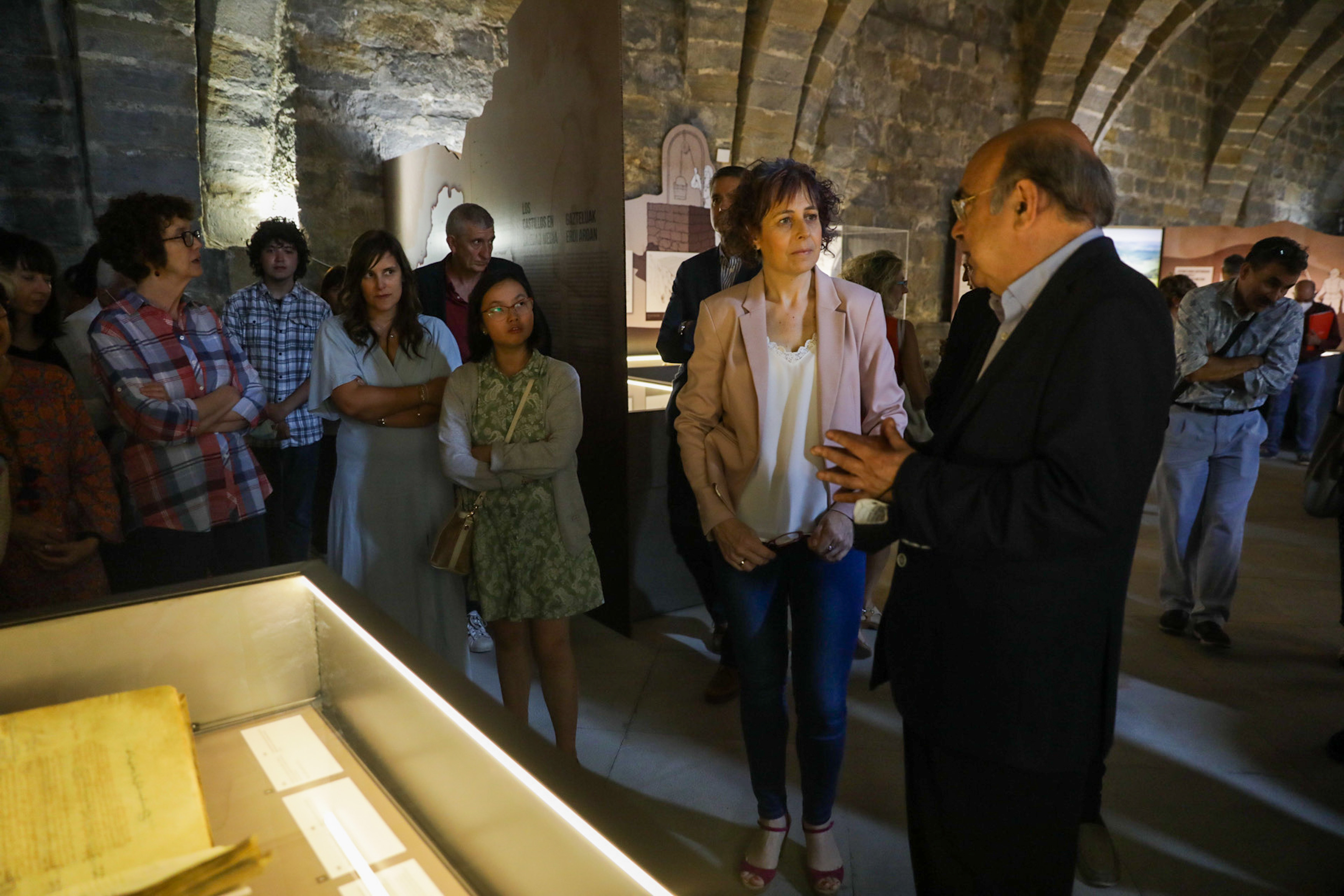La consejera de Cultura y Deporte, Rebeca Esnaola, ha participado en la apertura de la exposición comisariada por los doctores Juan José Martinena Ruiz, exdirector del Archivo Real y General de Navarra, y Jesús Sesma Sesma y Jesús García Gazólaz, arqueólogos del Gobierno de Navarra.