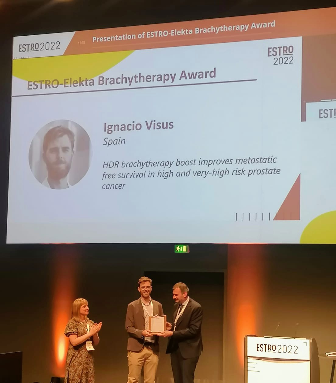 El doctor Ignacio Visus, del Servicio de Oncología Radioterápica del Hospital Universitario de Navarra (HUN), ha recibido de manos de la Doctora Henry y el Doctor  Tagliaferri de la Sociedad Europea de Oncología Radioterápica (ESTRO), el Premio al Trabajo más Innovador por un proyecto sobre la mejora en la supervivencia libre de metástasis con la Braquiterapia HDR (alta tasa de dosis) en pacientes con cáncer de próstata de alto y muy alto riesgo. Considera este estudio como la aportación más innovadora de Braquiterapia a nivel europeo en el año 2022.