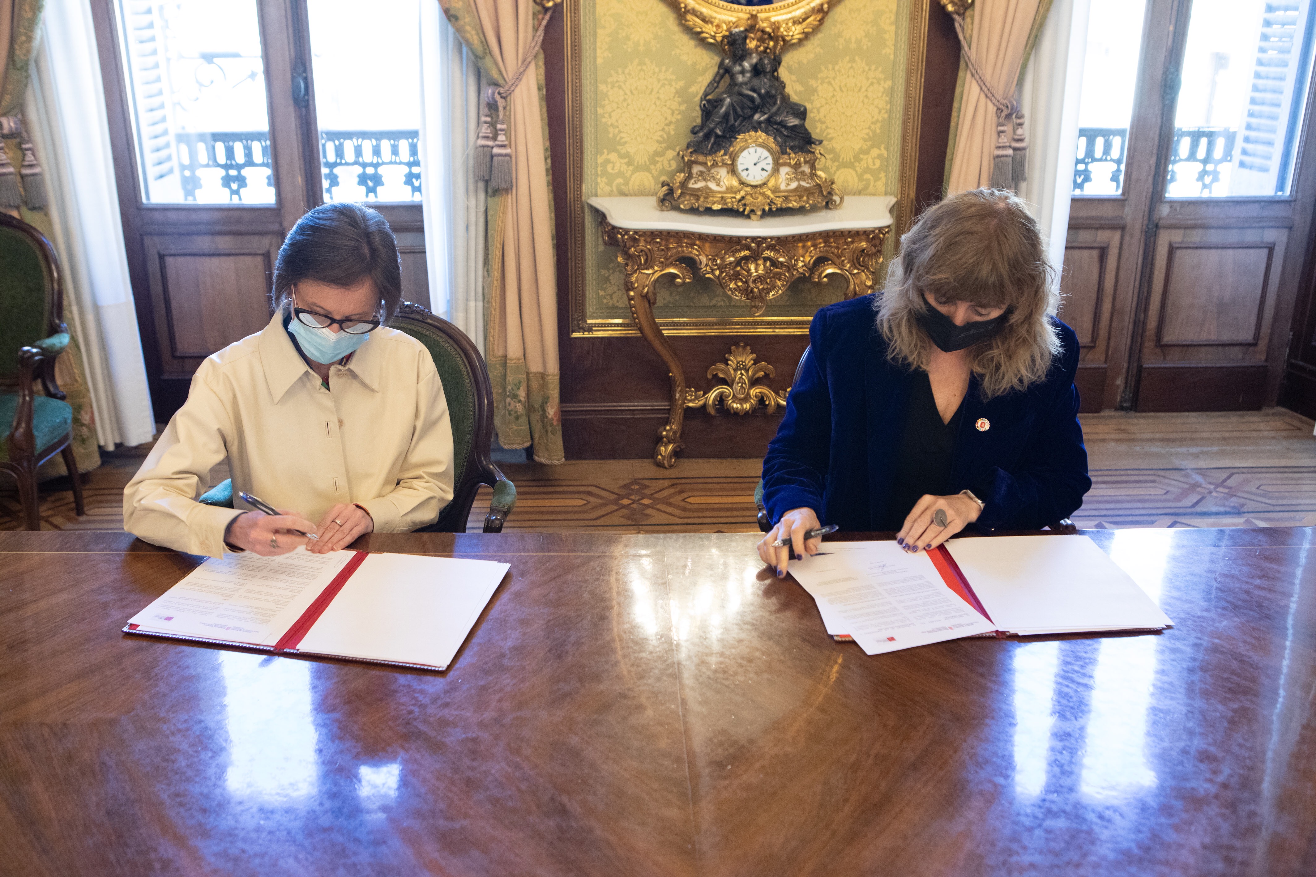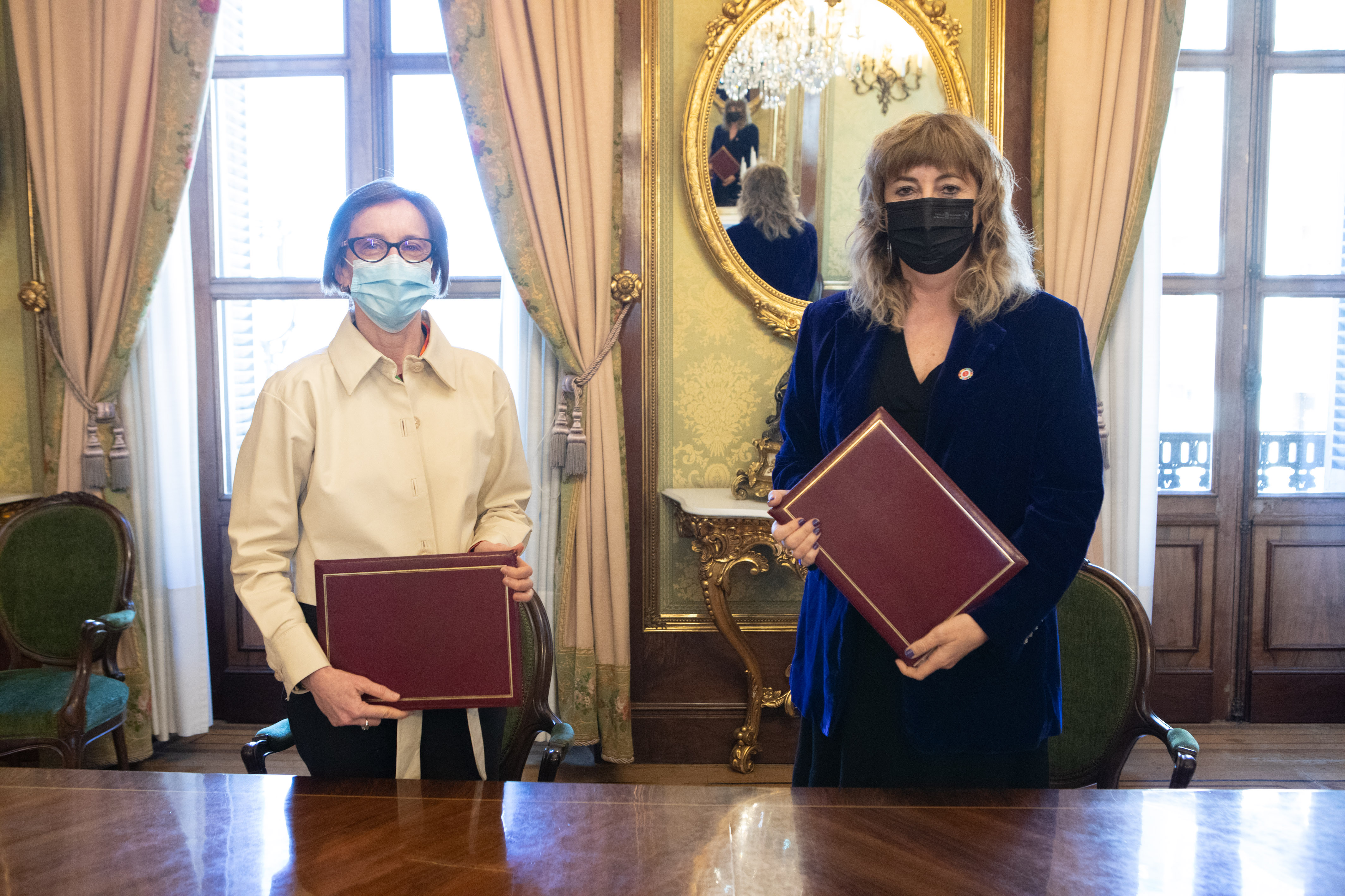 La consejera de Relaciones Ciudadanas del Gobierno de Navarra, Ana Ollo, y la presidenta de Eusko Ikaskuntza-Sociedad de Estudios Vascos, Ana Urkiza, han firmado en Pamplona / Iruña, el convenio de colaboración que fija el plan de actividades para 2022 entre Euskarabidea / Instituto Navarro del Euskera, organismo autónomo del Gobierno Foral, y la propia Eusko Ikaskuntza-Sociedad de Estudios Vascos.
