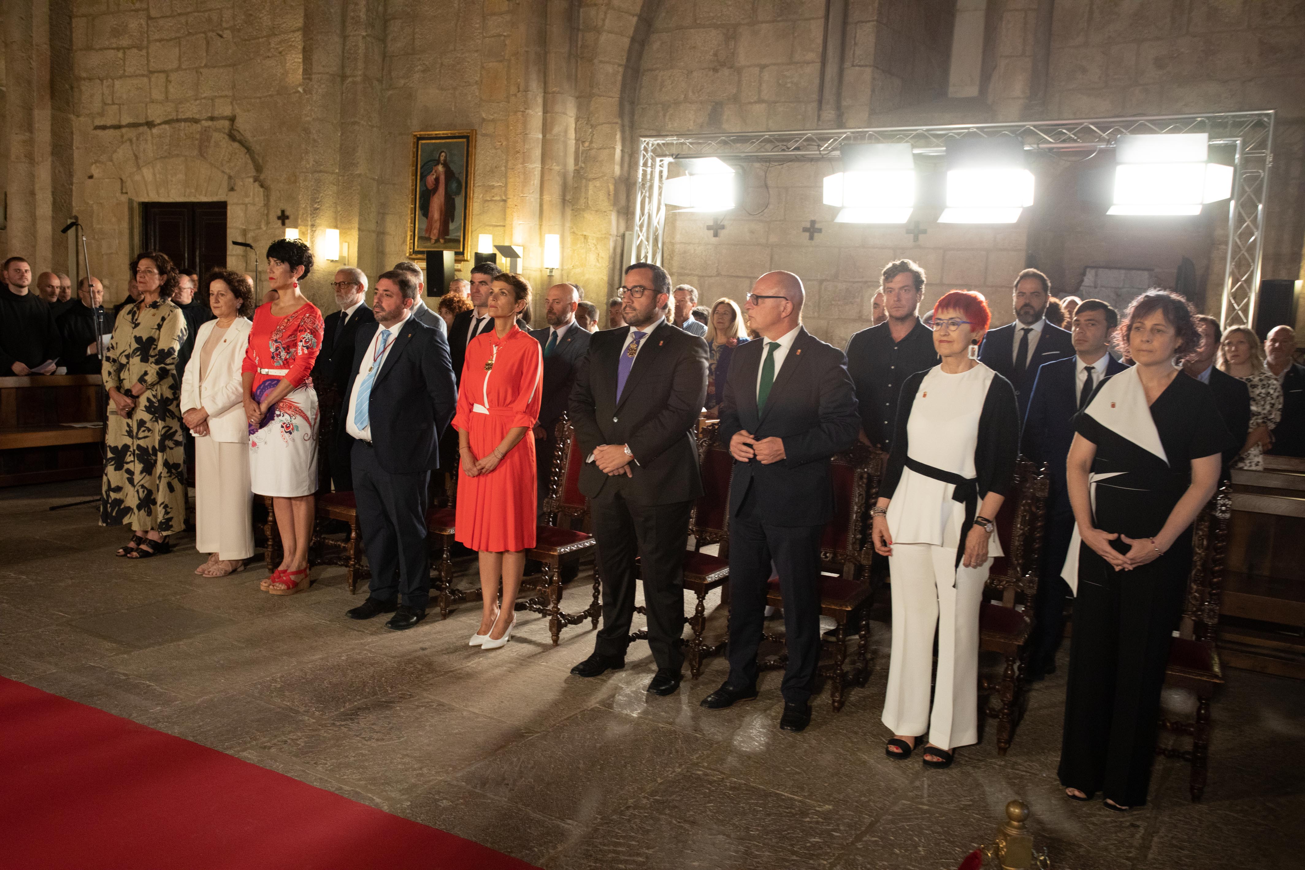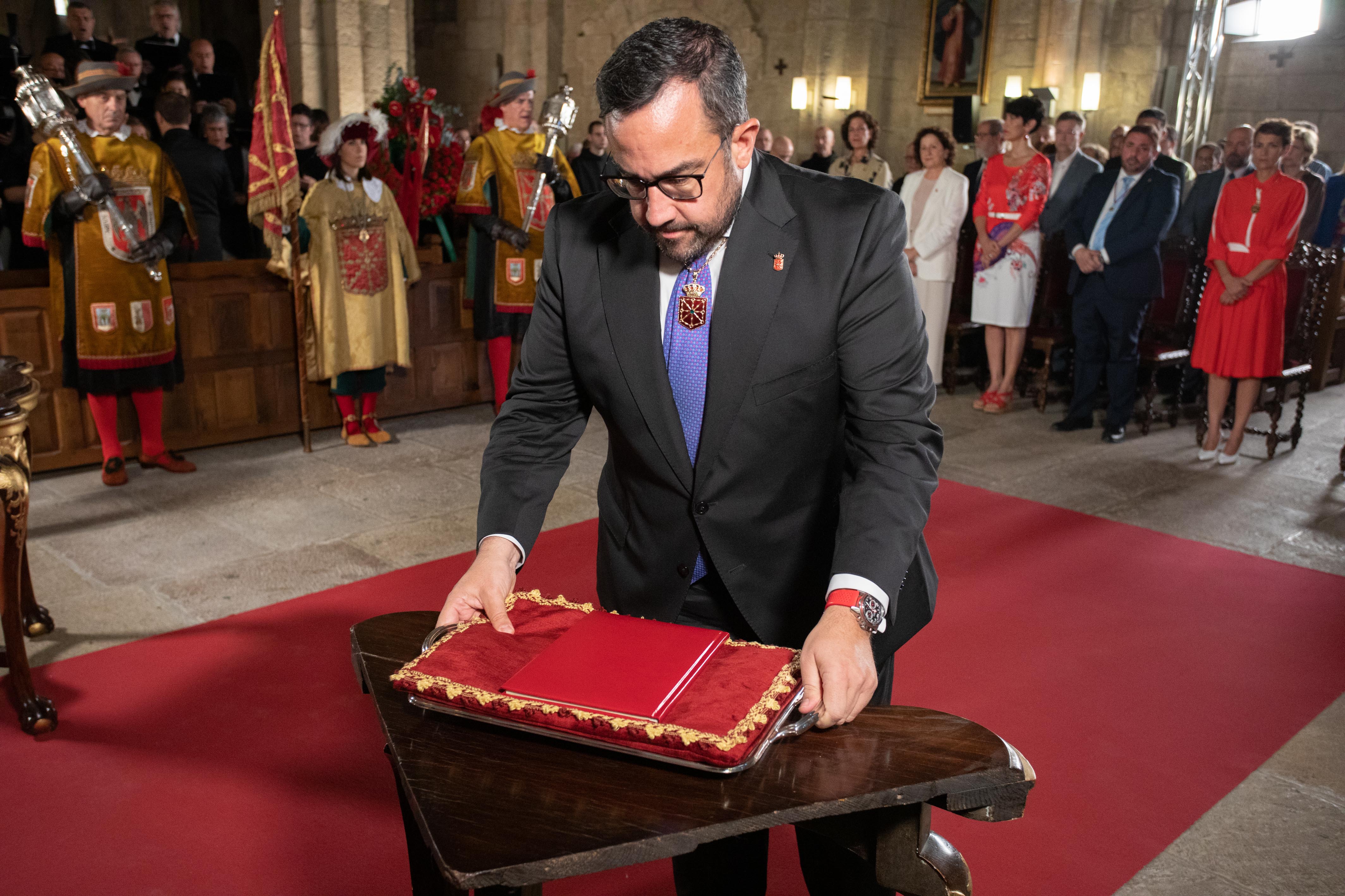 Al entrar en el templo, las autoridades han recibido el saludo del abad mitrado del monasterio, Juan Manuel Apesteguía, y han ocupado sus lugares frente al panteón real. A continuación se ha dado lectura, en castellano y en euskera, a un texto redactado por la historiadora Eloísa Ramírez, que explica el simbolismo de Leyre en la historia de Navarra, y se ha leído otro texto sobre la tradición de rendir homenaje a los reyes y reinas.