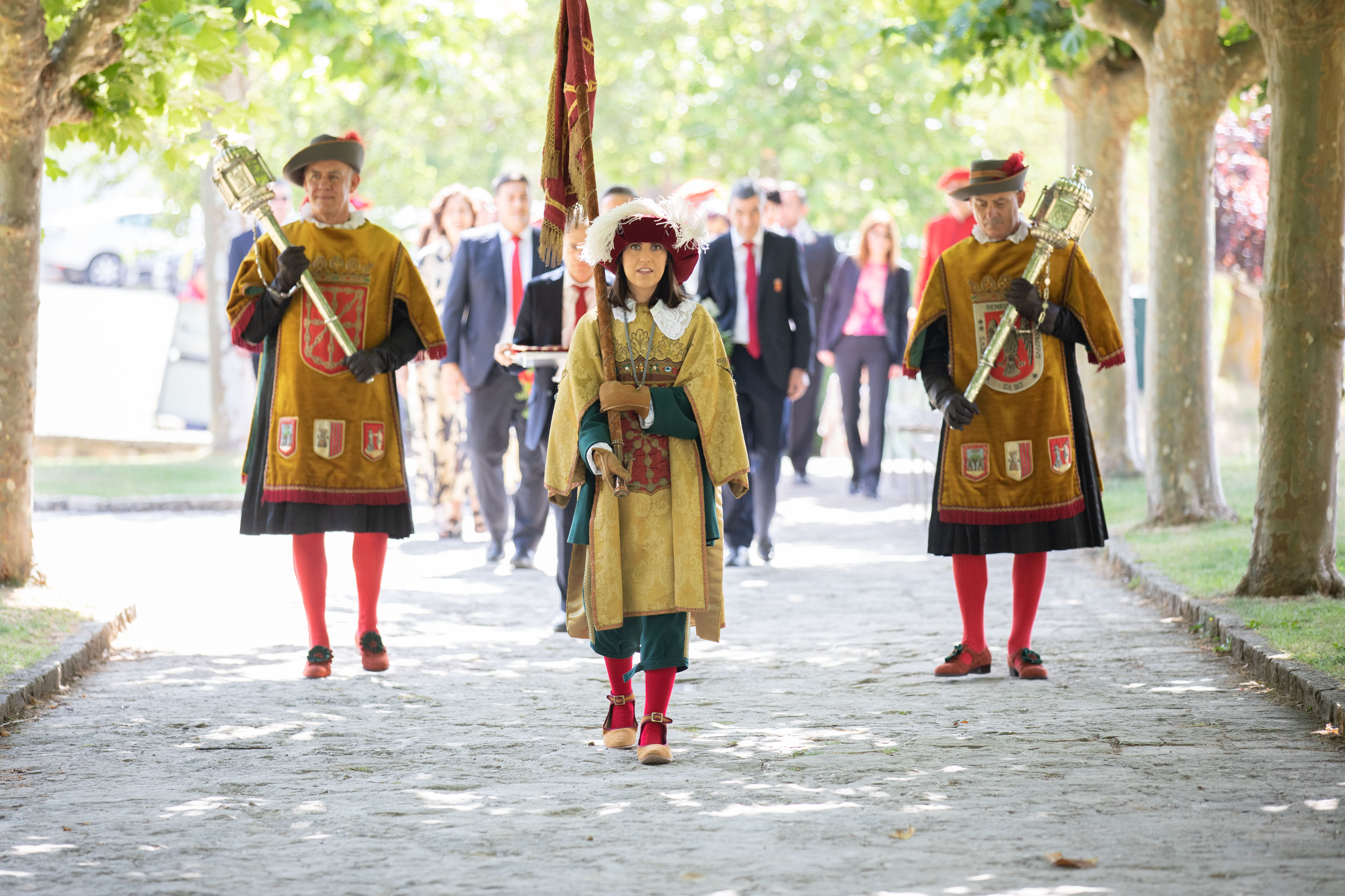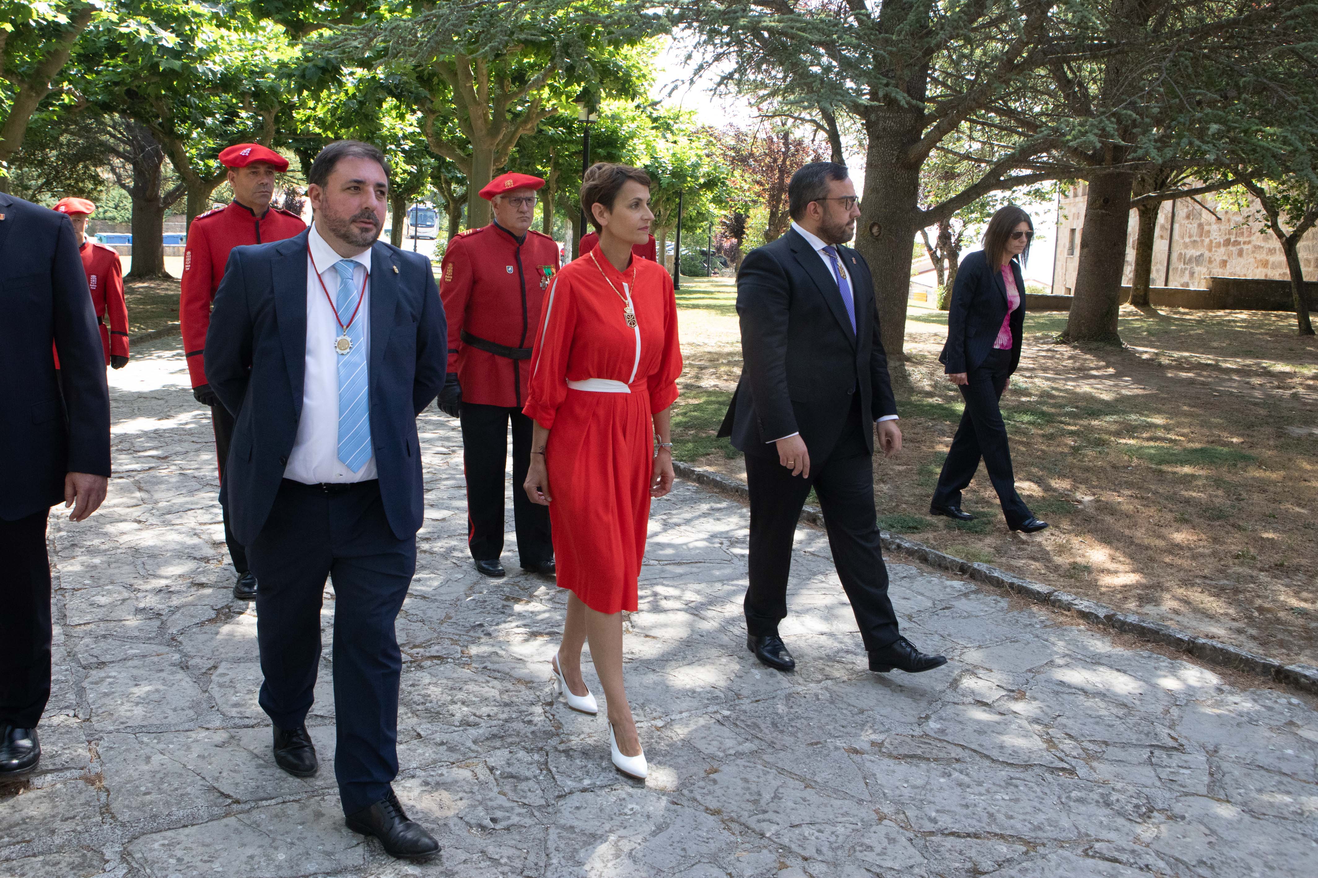 El acto, de carácter civil, ha dado comienzo con un recorrido por el recinto del monasterio del cortejo oficial, precedido por los ujieres que portaban la corona de flores y los objetos de la ofrenda, maceros, rey de armas, y seguido por las autoridades: la Presidenta Chivite, el presidente del Parlamento, Unai Hualde, y las consejeras y consejeros del Ejecutivo foral. Mientras avanzaba la comitivia, la Banda de Trompetas y Timbales del Gobierno ha interpretado el Himno de Navarra, Marcha para la entrada del Reyno.