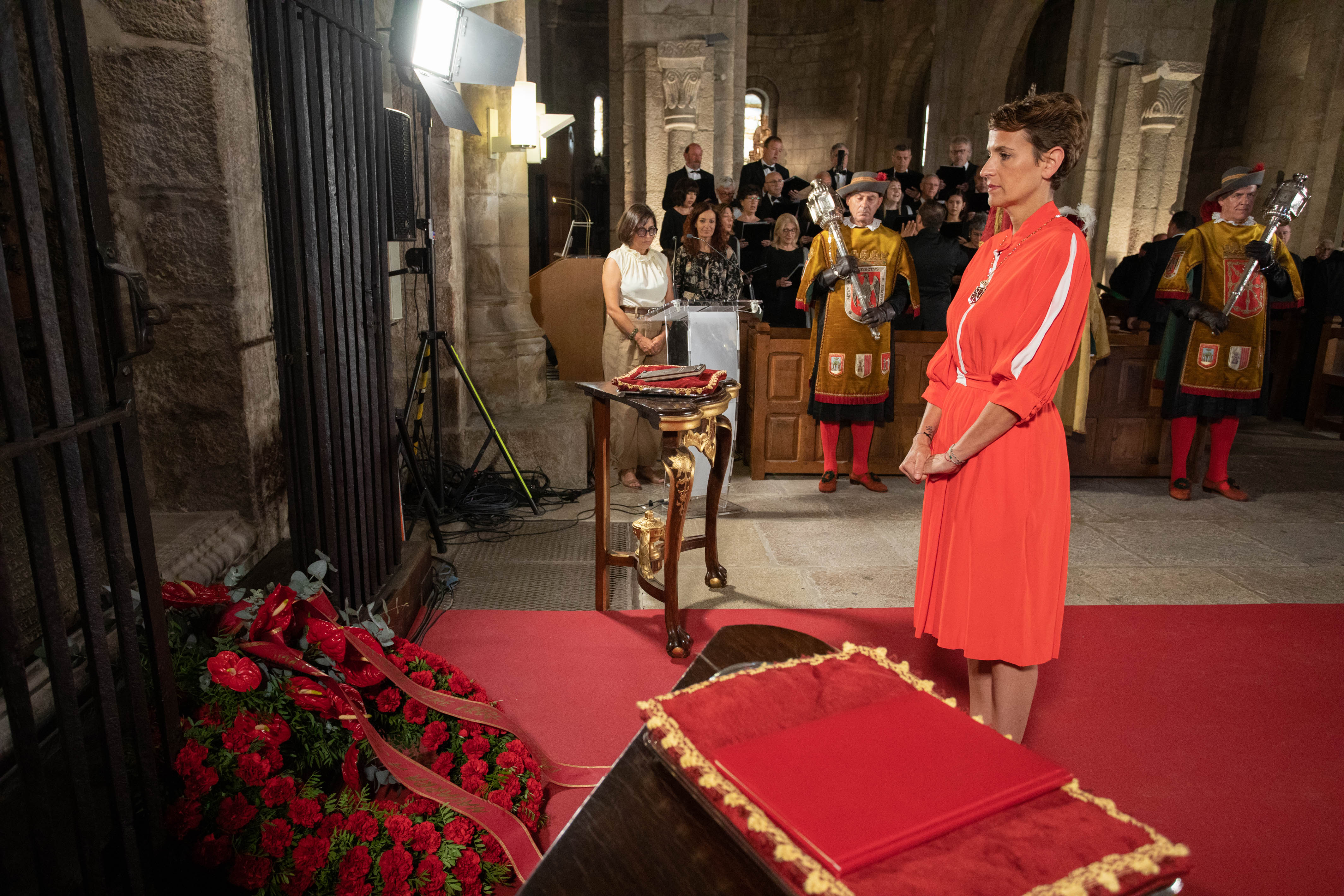 A continuación, ha tenido lugar la ofrenda de las instituciones forales (Parlamento, Gobierno y Presidenta) a las y los monarcas. En concreto, el vicepresidente primero, Javier Remírez, ha ofrecido el facsímil “Ceremonial de la coronación, unción y exequias de los reyes de Inglaterra”, y el presidente del Parlamento, Unai Hualde, ha hecho lo propio con otro facsímil de la redacción arcaica del Fuero Antiguo de Navarra (1238), bajo Teobaldo I. Para finalizar, la Presidenta Chivite ha depositado una corona de flores rojas con la leyenda “Navarra a sus reyes y reinas. Nafarroak, bere errege-erreginei”. La ofrenda ha concluido con la interpretación del Agur Jaunak.