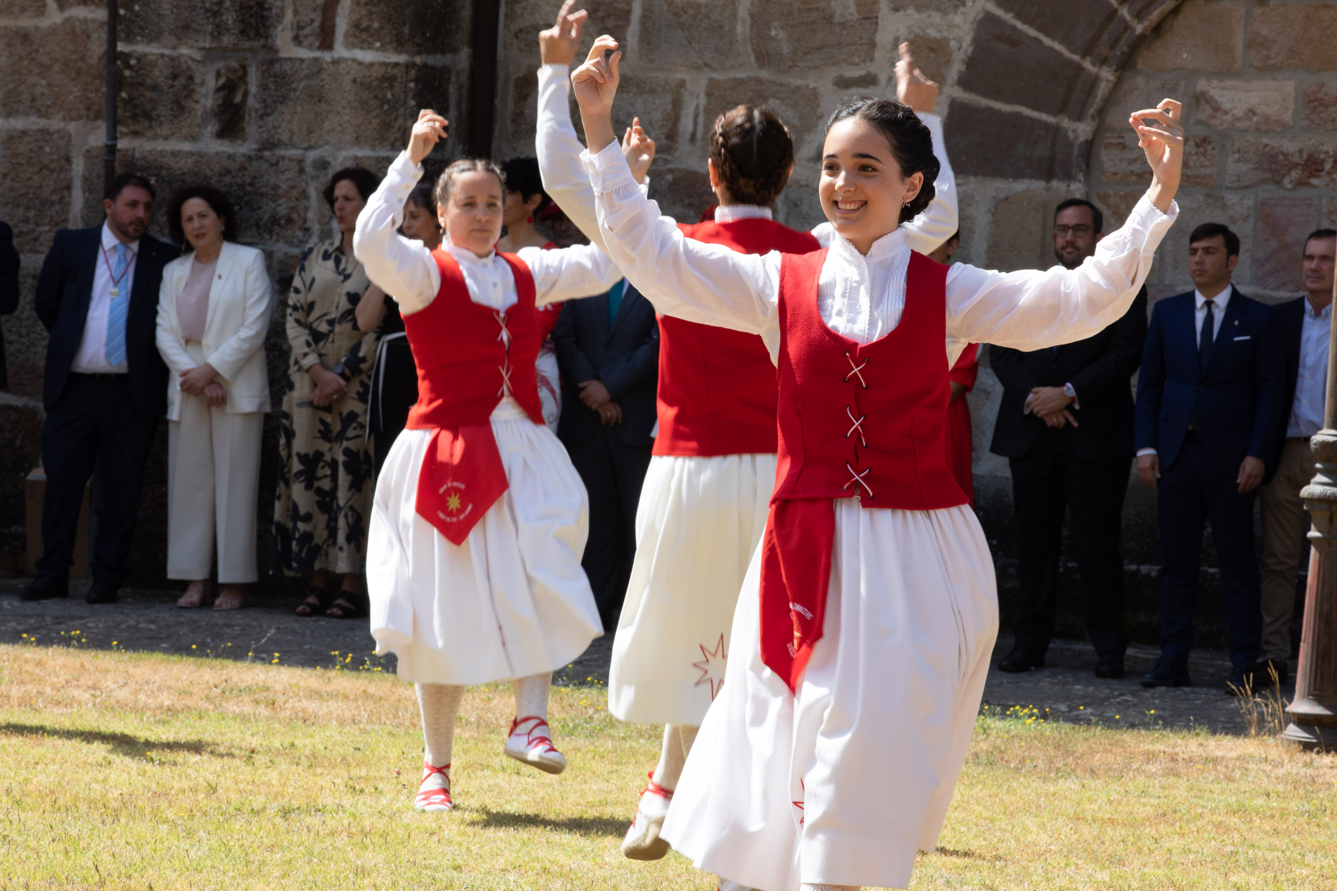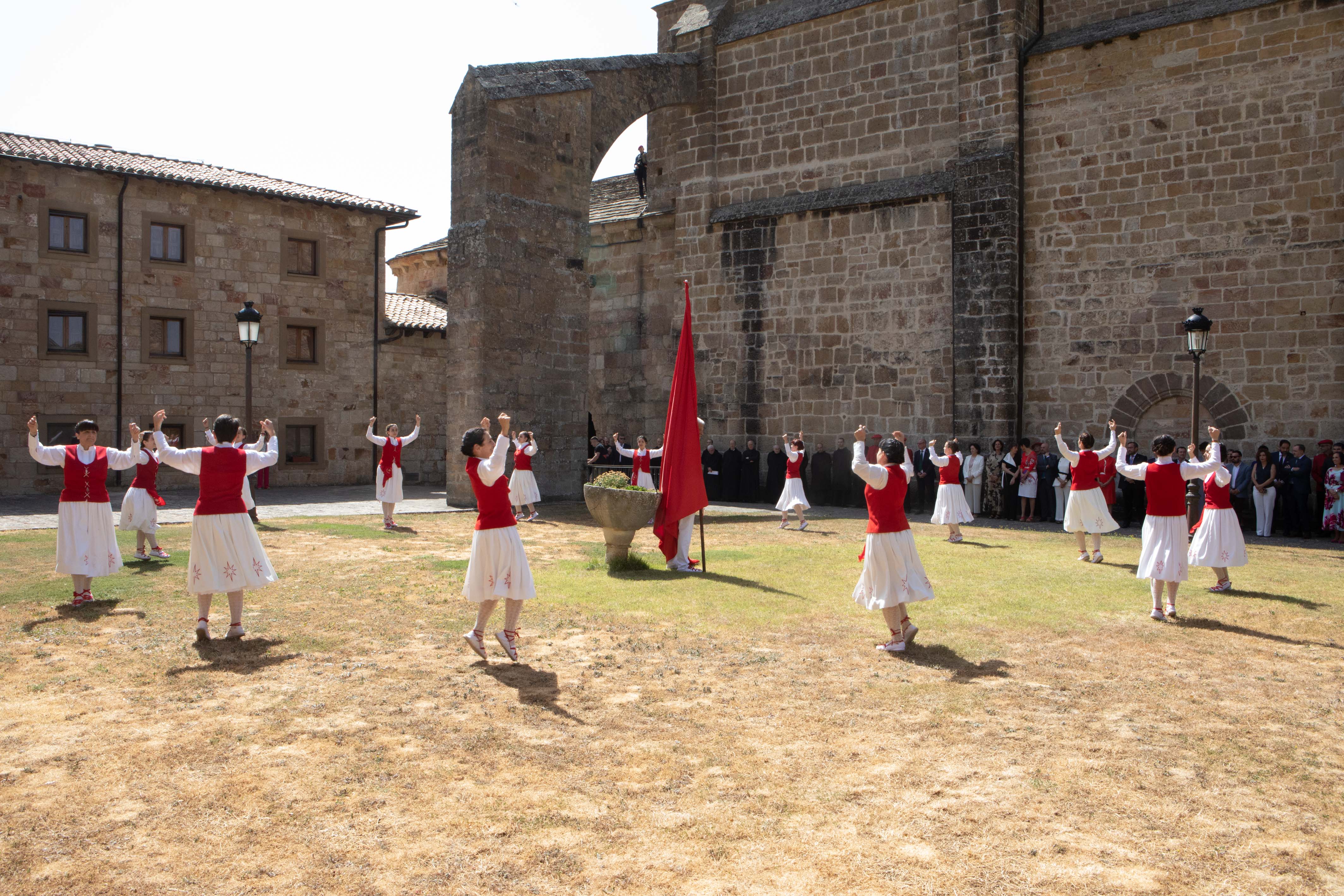 Tras finalizar el acto, la comitiva oficial ha posado en la escalinata ante la Porta Speciosa, y ha proseguido su recorrido hasta el patio de la Hospedería, donde el grupo de danzas Virgen del Puy y San Andrés de Estella-Lizarra ha ofrecido un espectáculo de danzas tradicionales representativas de su Merindad.
