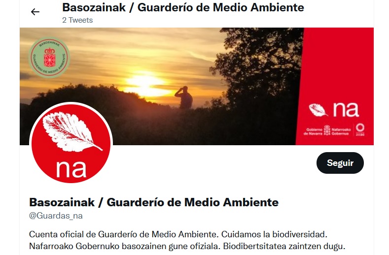 La Dirección General de Medio Ambiente ha puesto en marcha un nuevo perfil de Twitter de Basozainak-Guarderío de Medio Ambiente con el objetivo de divulgar, compartir y visibilizar el trabajo del colectivo sobre el terreno, la conservación de la naturaleza y el aprovechamiento sostenible de los recursos naturales de la Comunidad Foral y promover la educación ambiental, así como de establecer un cauce bidireccional y directo de comunicación con la ciudadanía.