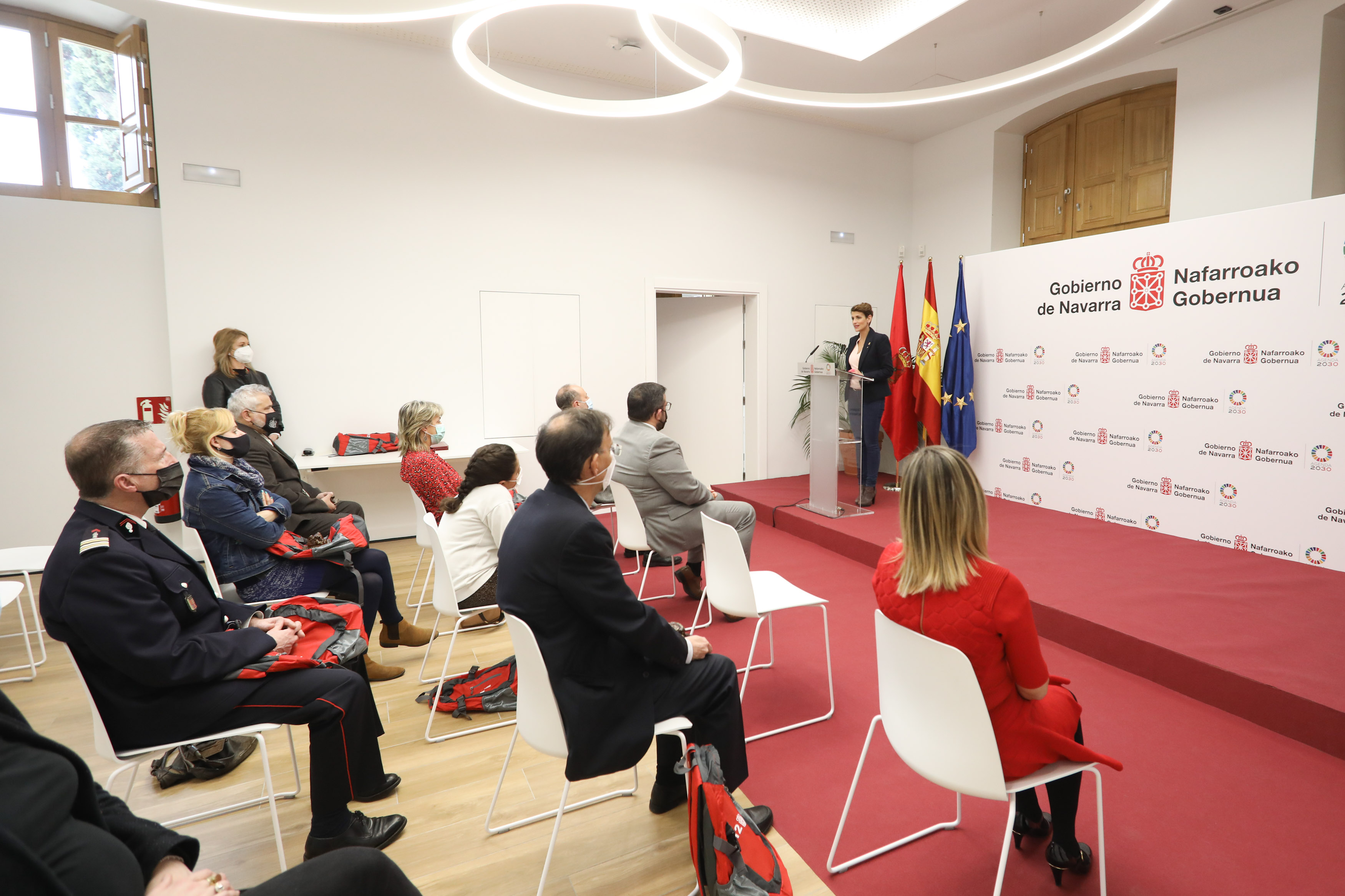 El evento ha estado presidido por la Presidenta de Navarra, María Chivite, y el vicepresidente primero y consejero de Presidencia, Igualdad, Función Pública e Interior, Javier Remírez. Asimismo, han estado presentes la directora general de Interior, Amparo López, y el director del Servicio de Protección Civil, José Javier Boulandier.