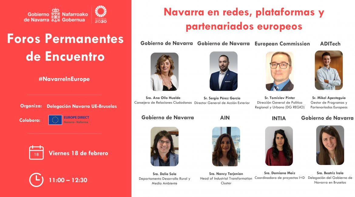 En el evento han intervenido la consejera de Relaciones Ciudadanas, Ana Ollo, el director general de Acción Exterior, Sergio Pérez y la técnica de la Delegación de Navarra en Bruselas, Beatriz Irala, junto a Tomislav Pinter, de la  Dirección General de Política Regional y Urbana de la Comisión Europea, Mikel Apesteguia,  gestor de programas y partenariados europeos  de  Aditech, Delia Sola, gestora de proyectos europeos de Gobierno de Navarra, Nancy Tarjenian, responsable del Clúster de Transformación Industrial de AIN y Damiana Maiz,  coordinadora de proyectos I+D de INTIA.