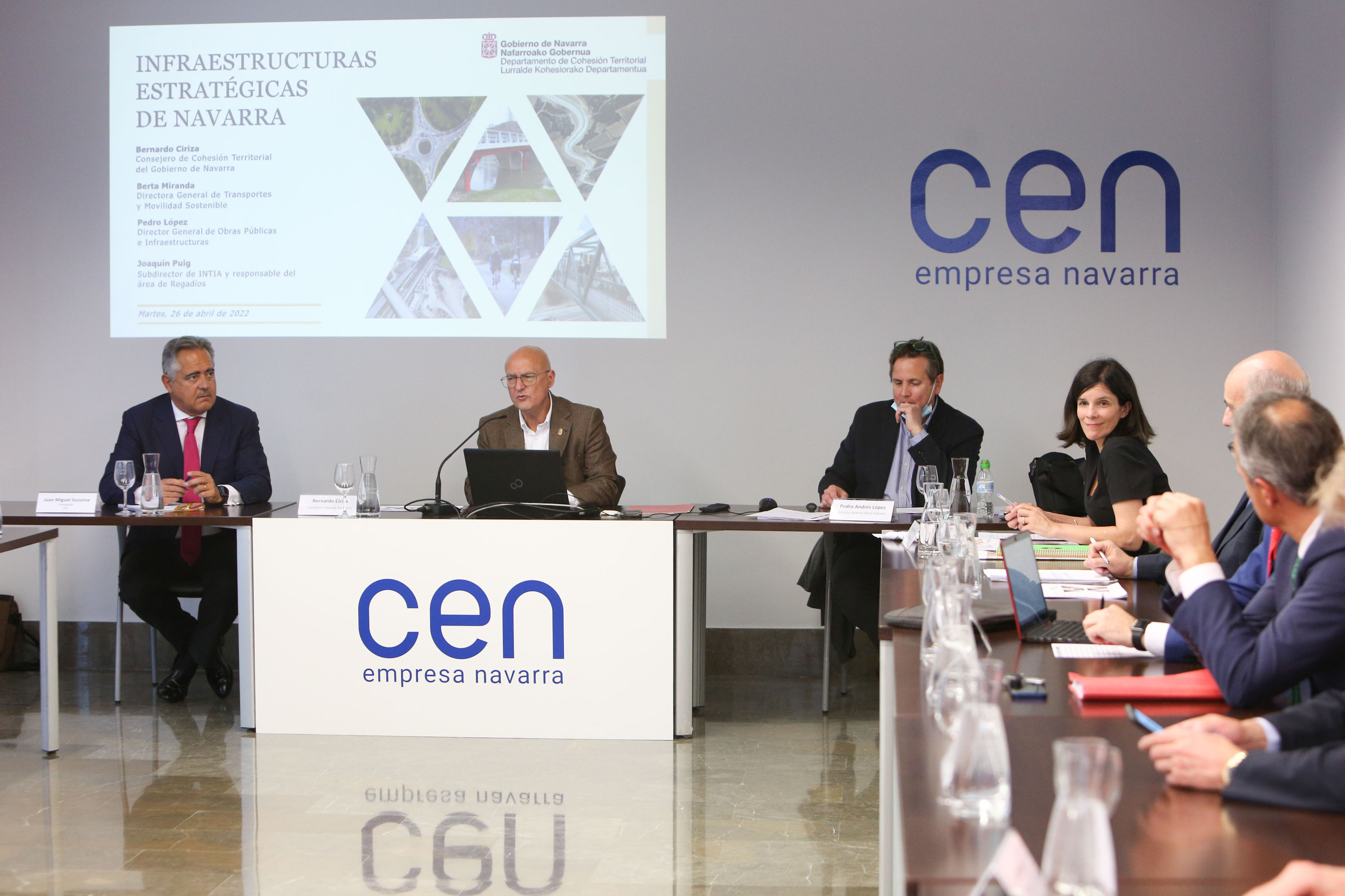 Así lo ha avanzado el consejero de Cohesión Territorial, Bernardo Ciriza, en la reunión mantenida esta tarde con el Comité Ejecutivo de la Confederación de Empresarios de Navarra (CEN). Al encuentro han acudido, también, el director general de Obras Públicas e Infraestructuras, Pedro López, la directora general de Transportes y Movilidad Sostenible, Berta Miranda, y Joaquín Puig, subdirector de INTIA y responsable del área de regadío.