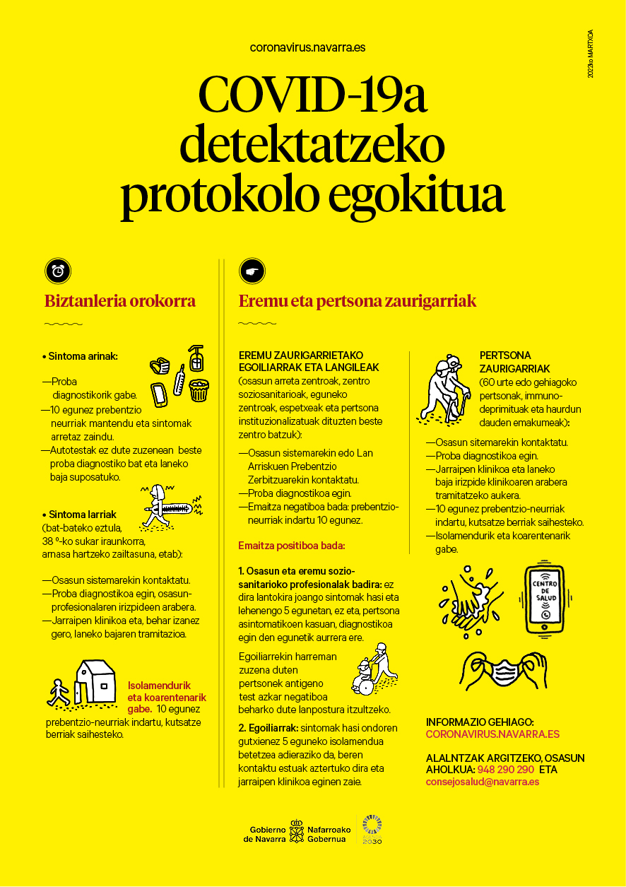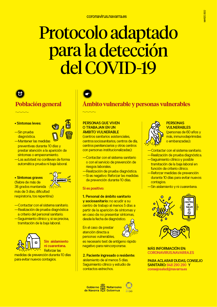 Como ya se anunció a principios de esta semana, Navarra comenzó a aplicar la nueva estrategia de vigilancia del COVID-19, en la que se prioriza la detección en personas y ámbitos de mayor vulnerabilidad y en personas con casos graves de la enfermedad.
