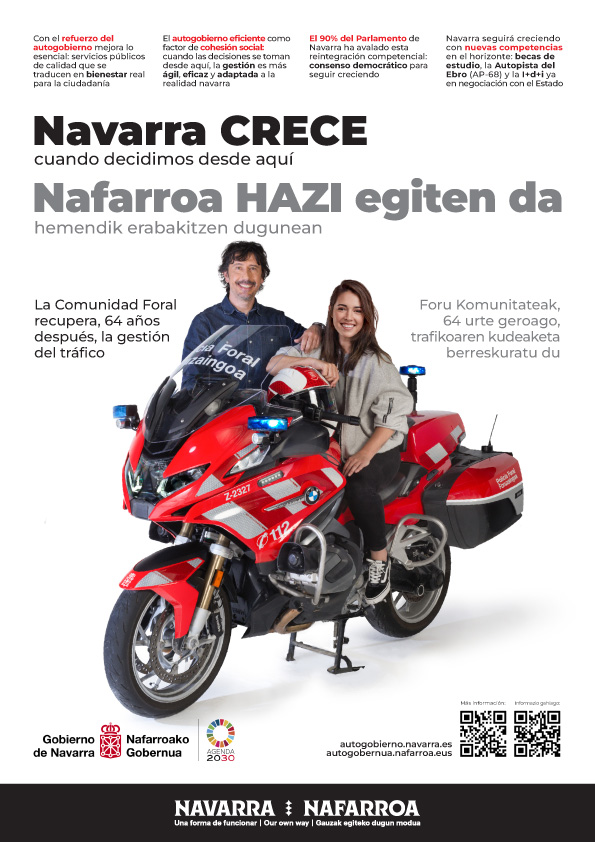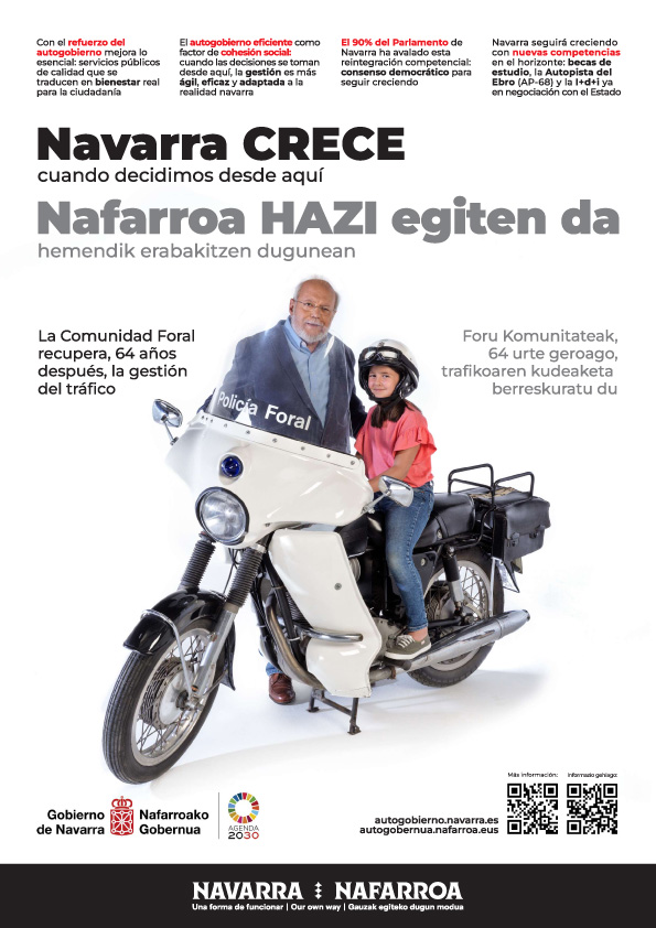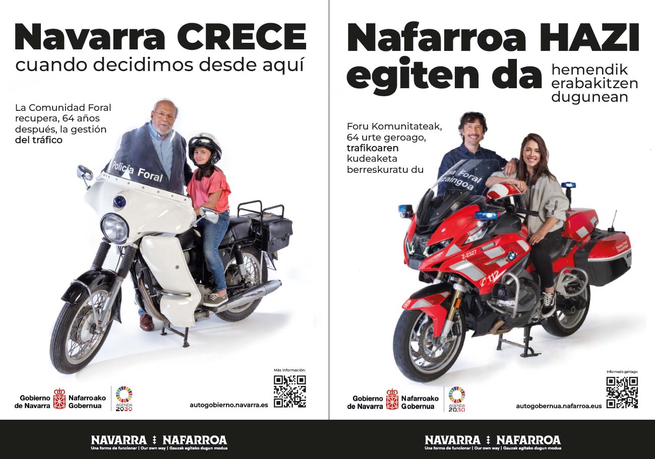 La campaña en defensa del autogobierno promovida por el Ejecutivo foral gira en torno a las imágenes de un abuelo y su nieta junto a una de las primeras motos de la Policía Foral que se conservan y de una pareja de mediana edad con una moto de la flota actual. La escena quiere reflejar el avance que supone para Navarra alcanzar nuevas cotas de autogobierno, apoyándose en la reciente adquisición de la competencia exclusiva en la vigilancia y control de carretas.