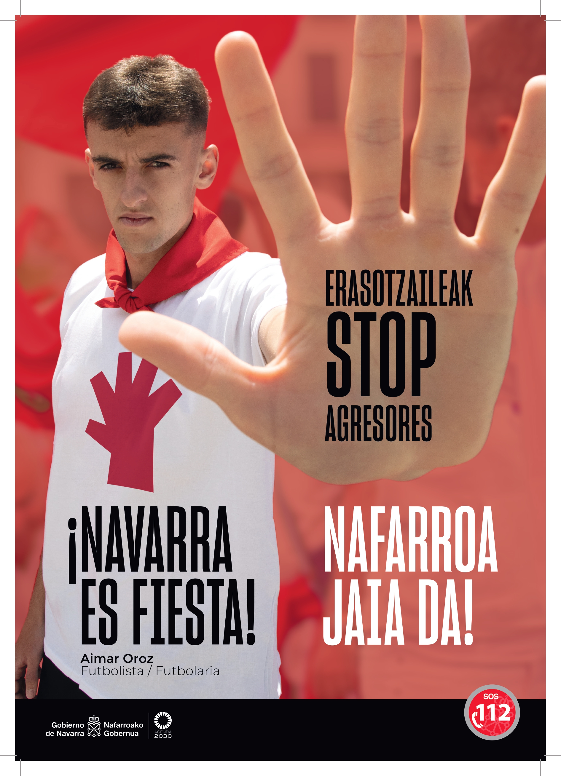 “Navarra es fiesta. Stop agresores / Nafarroa jaia da. Erasotzaileak Stop”, es el lema de la campaña del Gobierno de Navarra para reivindicar unas fiestas libres de agresiones sexistas protagonizada por el futbolista del C.A. Osasuna Aimar Oroz, el cantante Kutxi Romero, y el pelotari Unai Laso, comprometidos con un modelo de fiestas respetuoso e igualitario entre mujeres y hombres.