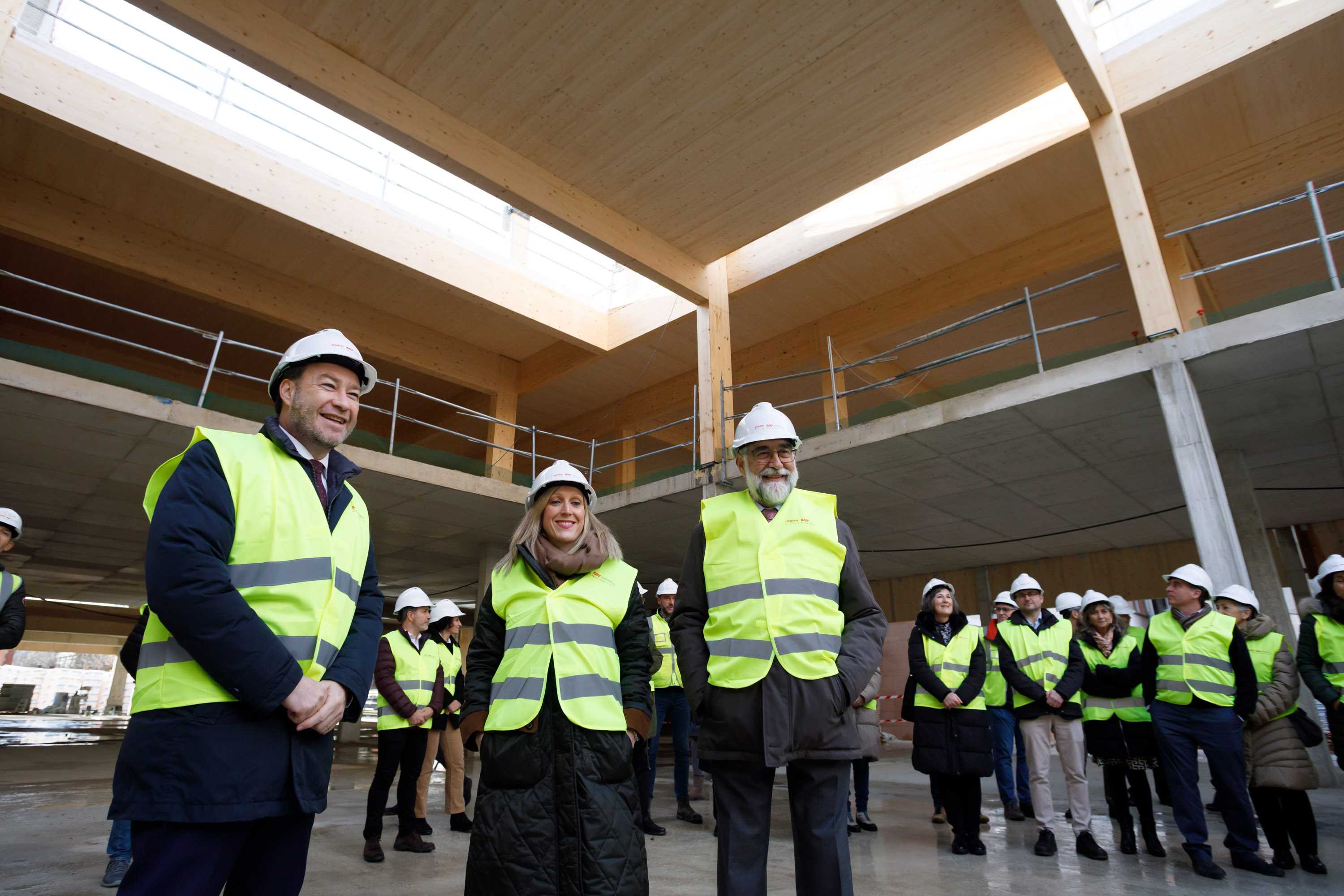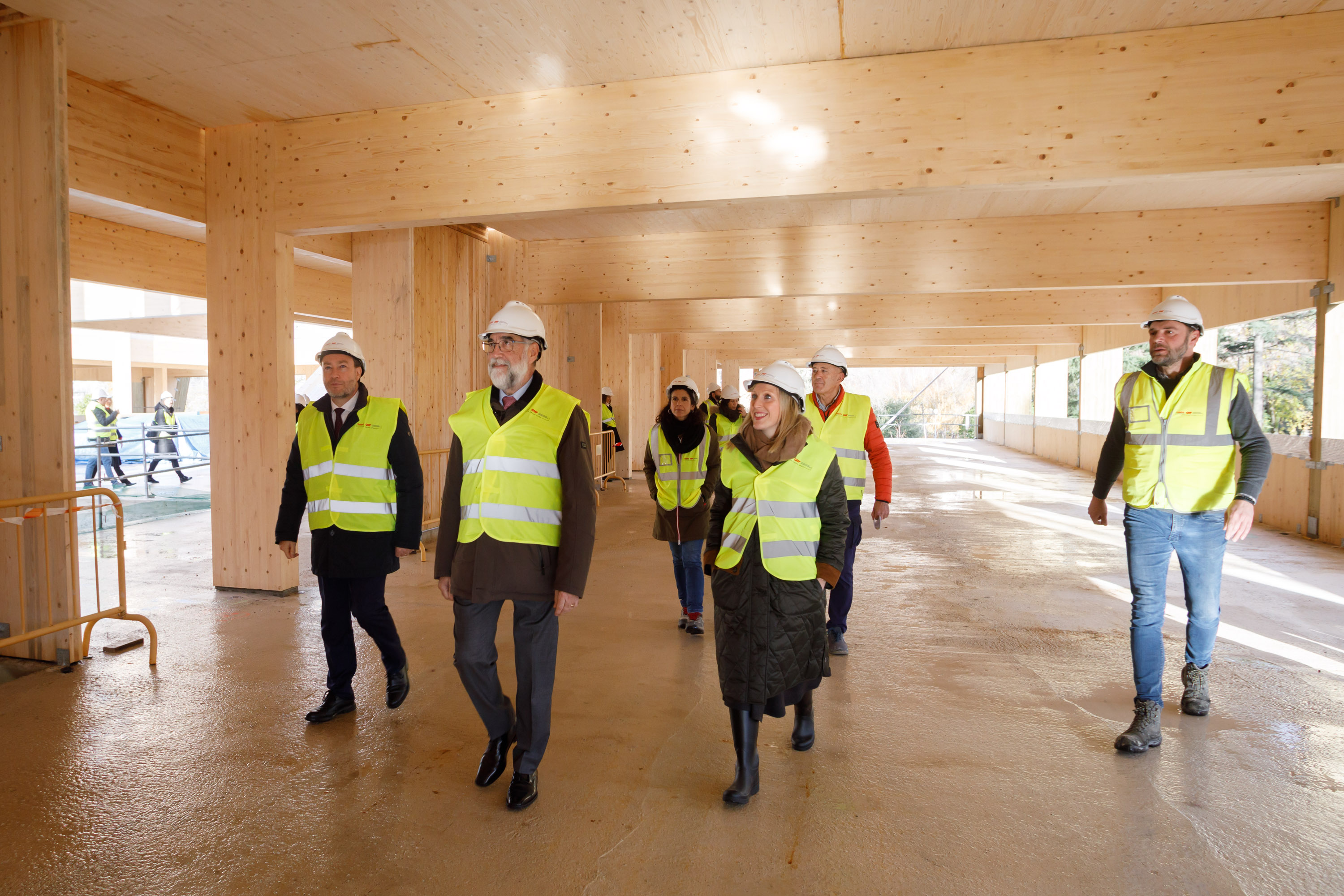 Una vez acabada la estructura de hormigón de las plantas sótano y baja, las dos empresas comenzaron el pasado mes de octubre la colocación de la estructura de madera laminada, cuya ejecución abarca siete meses y medio de trabajos. Se trata de una estructura formada por vigas y pilares de madera laminada de pino radiata que se completará con cerramientos verticales interiores y de fachada, así como con forjados de paneles de CLT (siglas en inglés de madera contralaminada). El montaje de la estructura se realiza con grúas torre y la estructura de madera laminada cubrirá 2.800 metros cuadrados por planta.