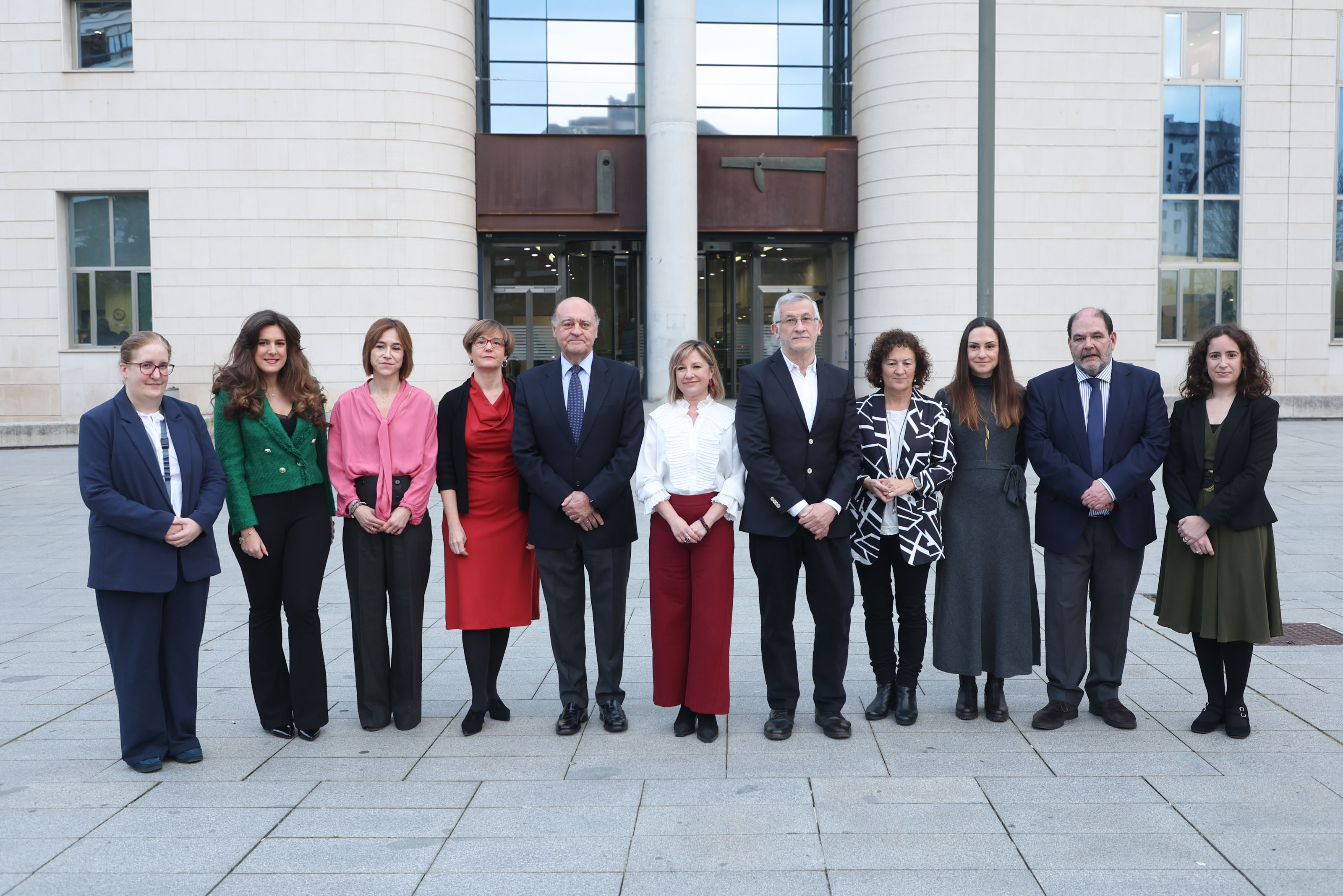 De izquierda a derecha: María Cruz García, fiscal de Violencia sobre la Mujer; Paula López, jueza de refuerzo en el Juzgado de Violencia sobre la Mujer número 1; Esther Fernández, magistrada del Juzgado de Violencia sobre la Mujer número 1; María Alemán, jueza decana de todos los juzgados unipersonales; Joaquín Galve, presidente del Tribunal Superior de Justicia de Navarra; Amparo López, consejera de Interior, Función Pública y Justicia; Félix Taberna, vicepresidente primero y consejero de Presidencia e Igualdad; Maite Arenaza, directora general de Justicia; Aranzazu Gargallo, letrada de la Administración de Justicia; Javier Isasi, secretario de Gobierno de Justicia; y Ángela Fernández, magistrada del Juzgado de Violencia sobre la Mujer número 2.