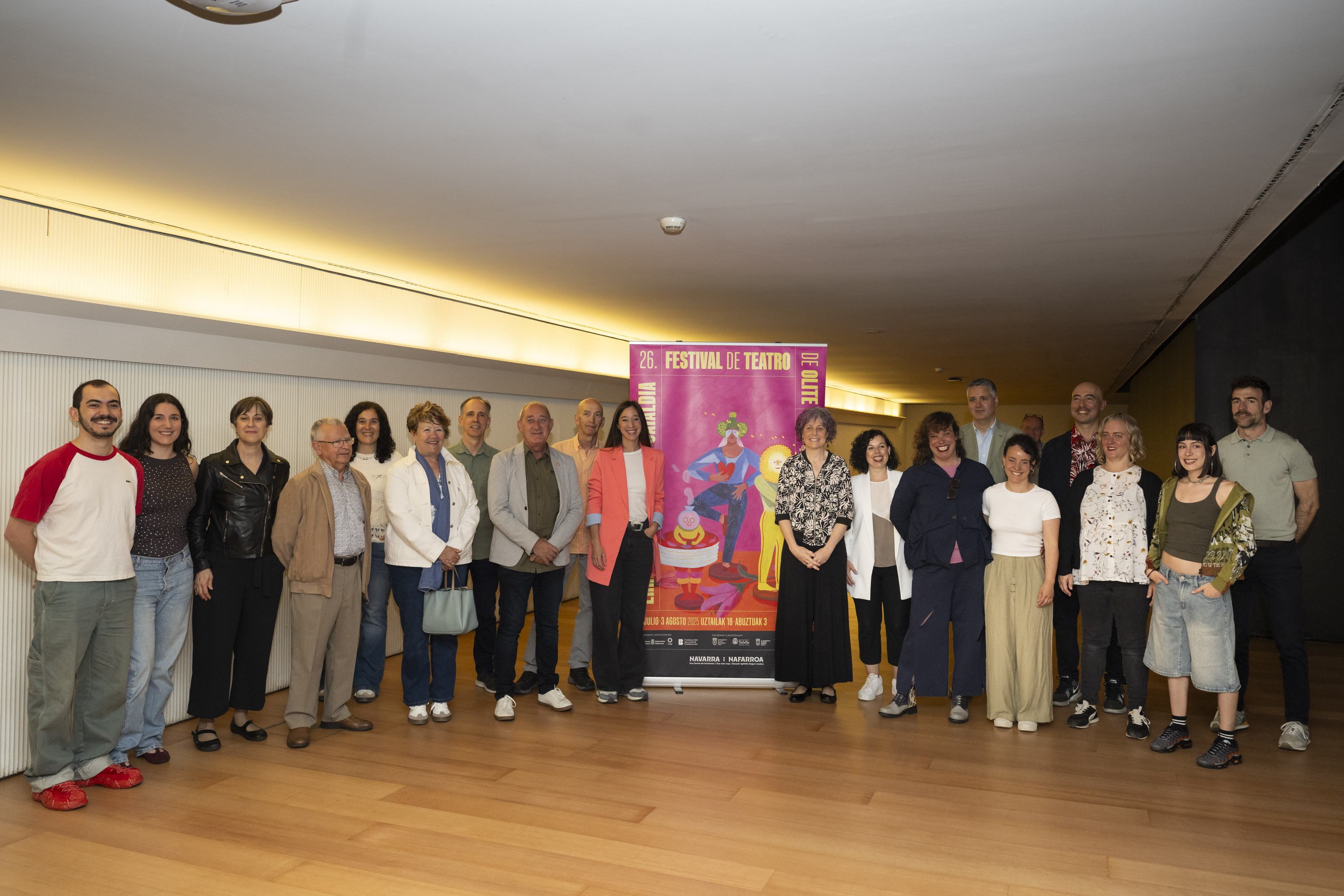 La consejera de Cultura, Deporte y Turismo, Rebeca Esnaola; las directoras artísticas del certamen, Ane Pikaza y María Goiricelaya; el director del servicio de Acción Cultural del Gobierno de Navarra, Lorenzo García Echegoyen; las compañías seleccionadas para las residencias de trabajo y la creadora de la imagen del cartel; han presentado esta mañana en Baluarte la programación de la próxima edición.