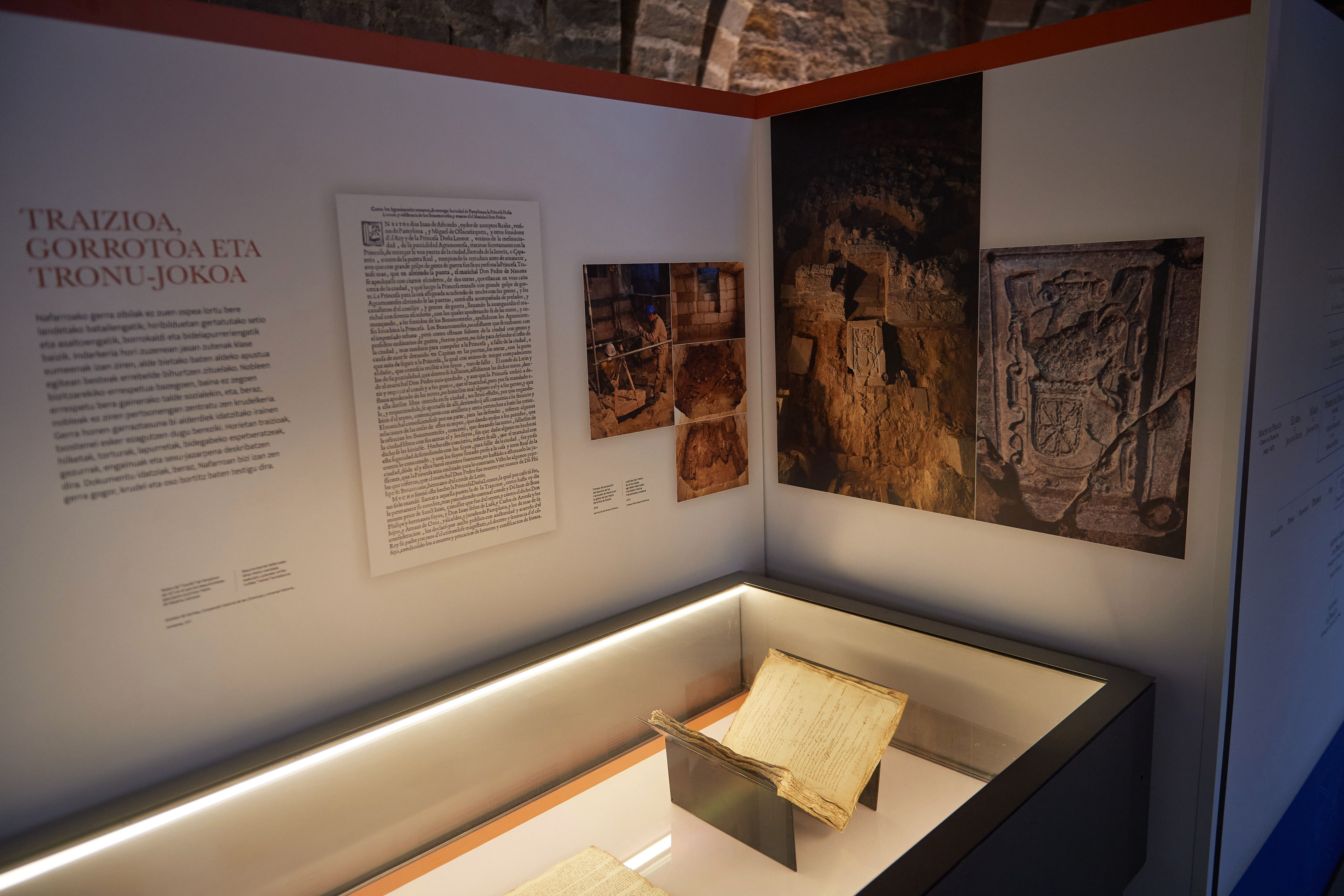 En las vitrinas destacan piezas singulares como el Libro de Armería del Reino de Navarra del siglo XVI, único armorial oficial conservado en España, el polémico testamento de la reina Blanca de Navarra de 1439, la magnífica Crónica de los Reyes de Navarra escrita por el Príncipe de Viana, el Lamento de Navarra del vicecanciller Pedro de Sada o el perdón de Pamplona concedido por el emperador Carlos V en 1523.