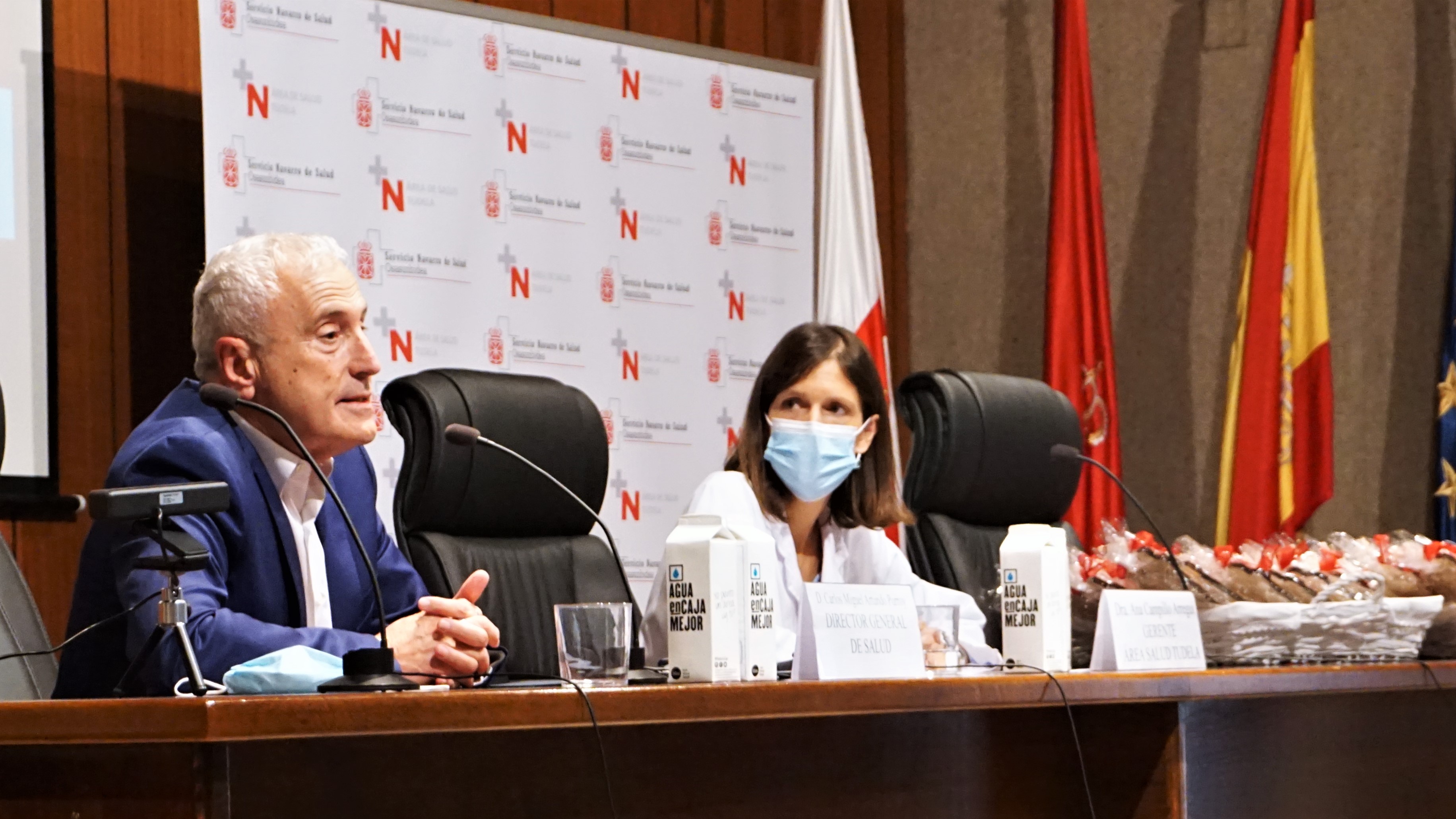 El director general de Salud, Carlos Artundo, y la gerente del Área de Salud de Tudela, Ana Campillo han participado esta mañana en el Hospital Reina Sofía, en el acto de reconocimiento a 41 profesionales del Servicio Navarro de Salud-Osasunbidea que se jubilaron durante 2020 y 2021.