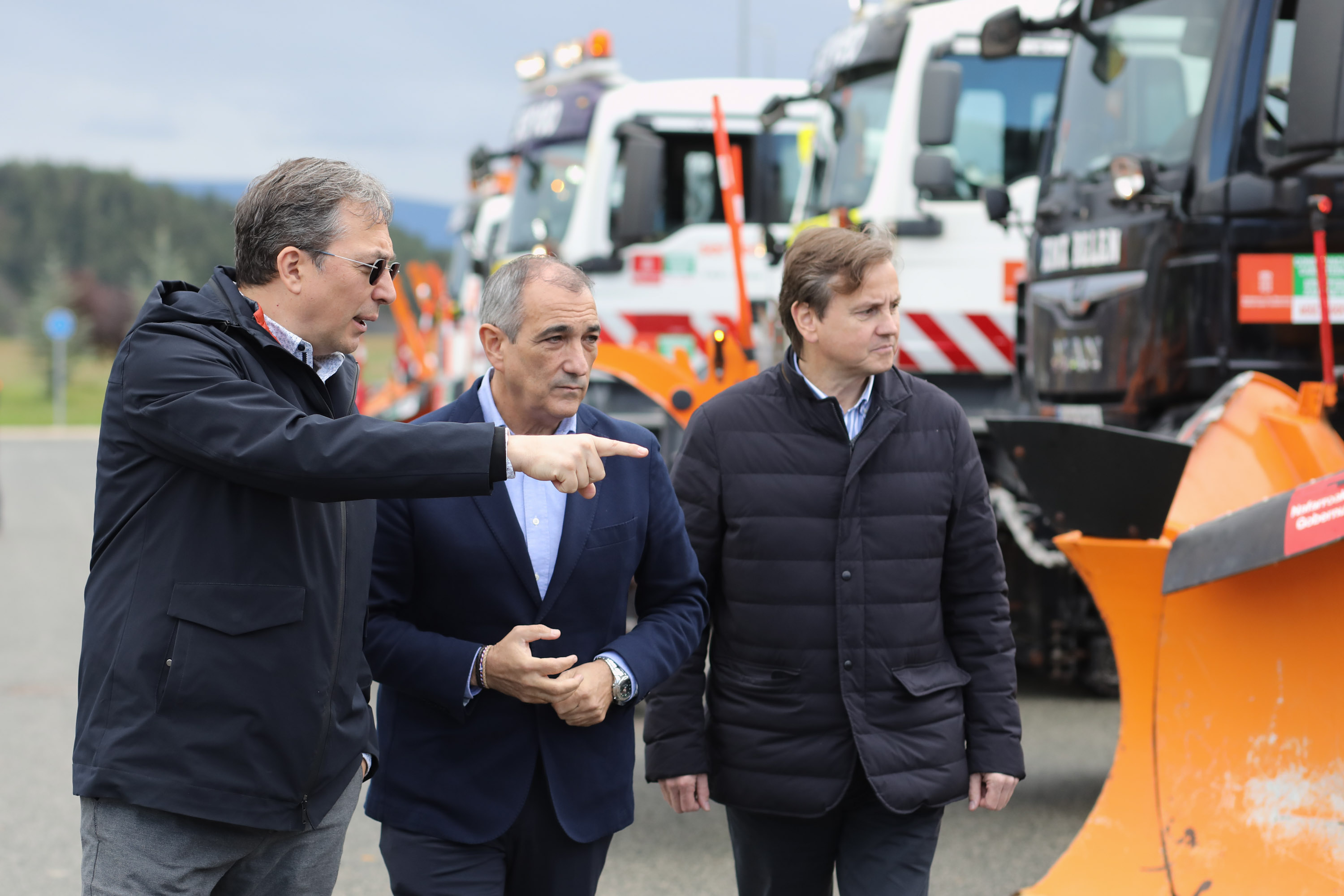 El consejero de Cohesión Territorial, Óscar Chivite, el director general de Obras Públicas e Infraestructuras, Pedro López, y el director del Servicio de Conservación, Pablo González, han visitado el Centro de Conservación de Aoiz para conocer de primera mano los detalles del Plan de Vialidad Invernal de la Red de Carreteras de Navarra, que estará activo hasta el 30 de abril, sujeto a posibles modificaciones en función de las necesidades meteorológicas.