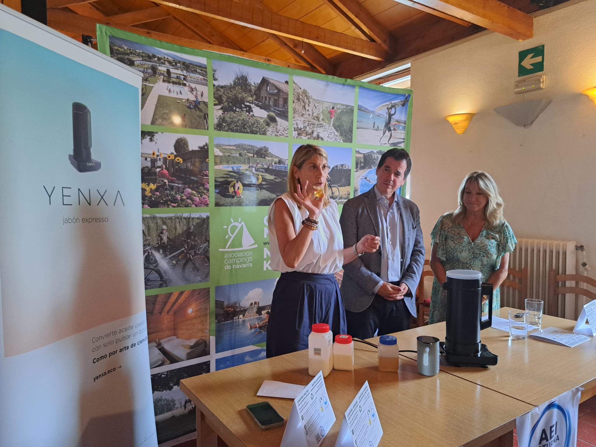 ‘YENXA’, es un innovador electrodoméstico patentado capaz de transformar el aceite doméstico usado en jabón de lavadora. Con este dispositivo se puede producir jabón líquido libre de fosfatos, sulfatos, blanqueadores ópticos y parabenos. Mediante un proceso que dura 80 minutos, ‘YENXA’ puede transformar 180 ml. de aceite usado en más de medio litro de jabón. Los campings de Navarra pretenden así implicar a sus clientes en la concienciación medioambiental, minimizando el impacto de un residuo como el aceite que, de eliminarse de forma inadecuada, posee una notable capacidad de contaminación”, han señalado desde ‘Almotech’.