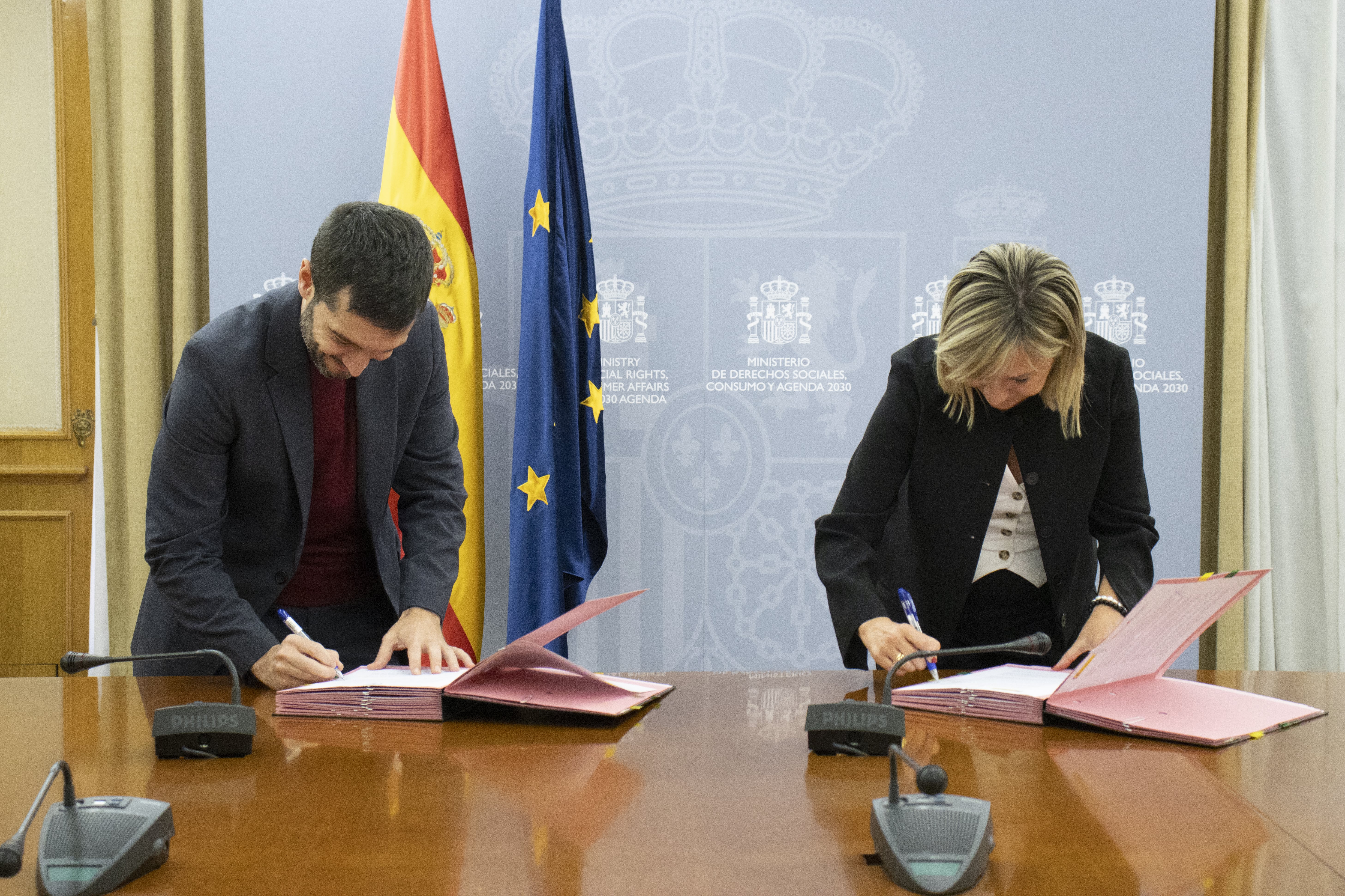 El ministro de Derechos Sociales, Consumo y Agenda 2030, Pablo Bustinduy, y la consejera de Interior, Función Pública y Justicia del Gobierno de Navarra, Amparo López, han suscrito un convenio para establecer un mecanismo de colaboración para compartir entre ambas administraciones los datos de los registros de personas que se han prohibido, voluntariamente, la entrada en locales y establecimientos de juego, así como el desarrollo de los procesos informáticos necesarios para este fin.