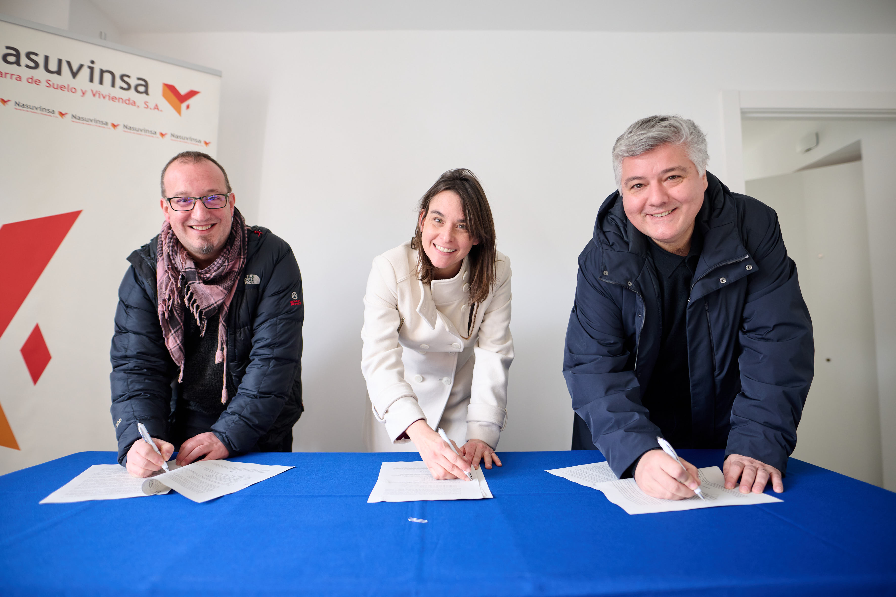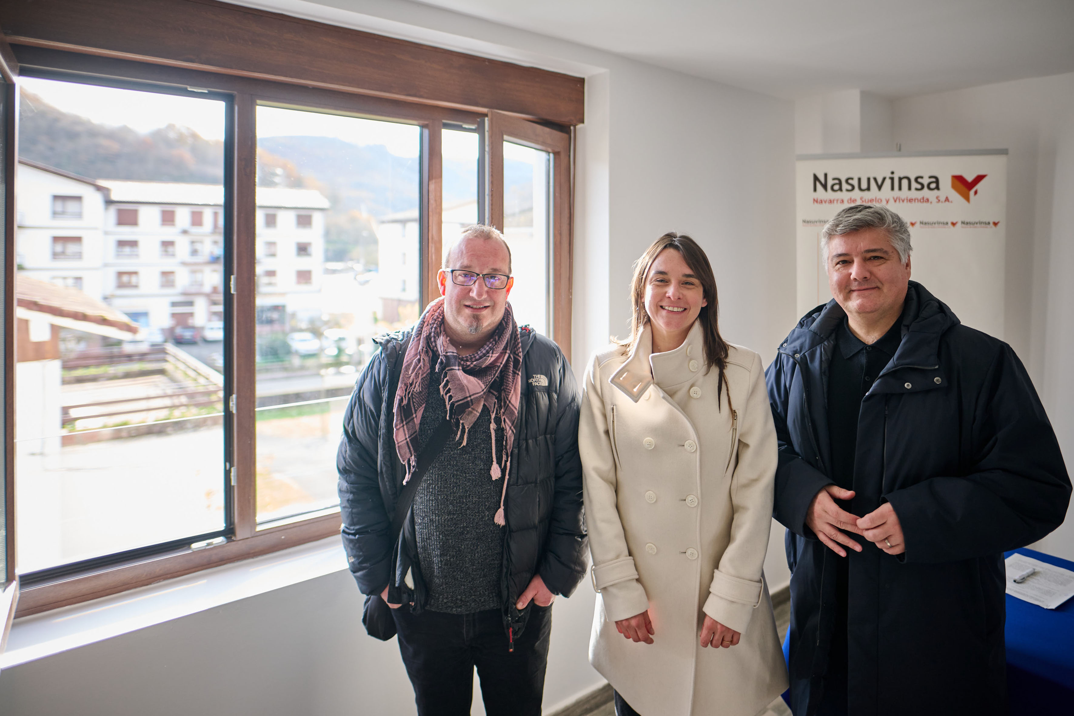 La vicepresidenta y consejera de Vivienda, Juventud y Políticas Migratorias del Gobierno de Navarra, Begoña Alfaro; el alcalde de Baztan, Fernando Anbustegi; y el director gerente de Nasuvinsa, Javier Burón, han firmado hoy el acuerdo de colaboración por el que el Ayuntamiento del Valle asume la gestión directa en régimen de alquiler protegido de cinco antiguos pisos de camineros adscritos al Fondo Foral de Vivienda Social, que acaban de ser rehabilitadas por la citada sociedad pública con una inversión global de 325.048 €.