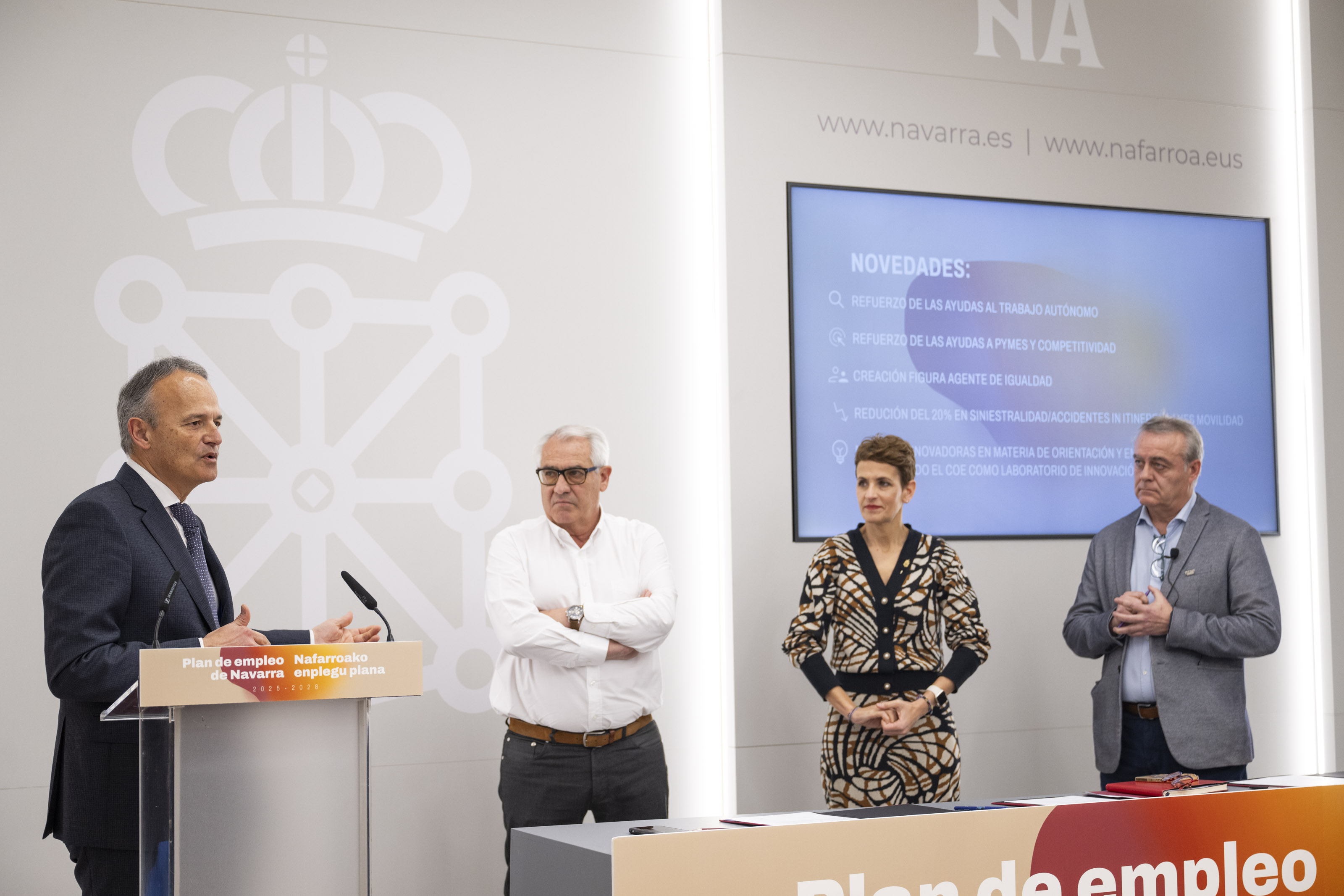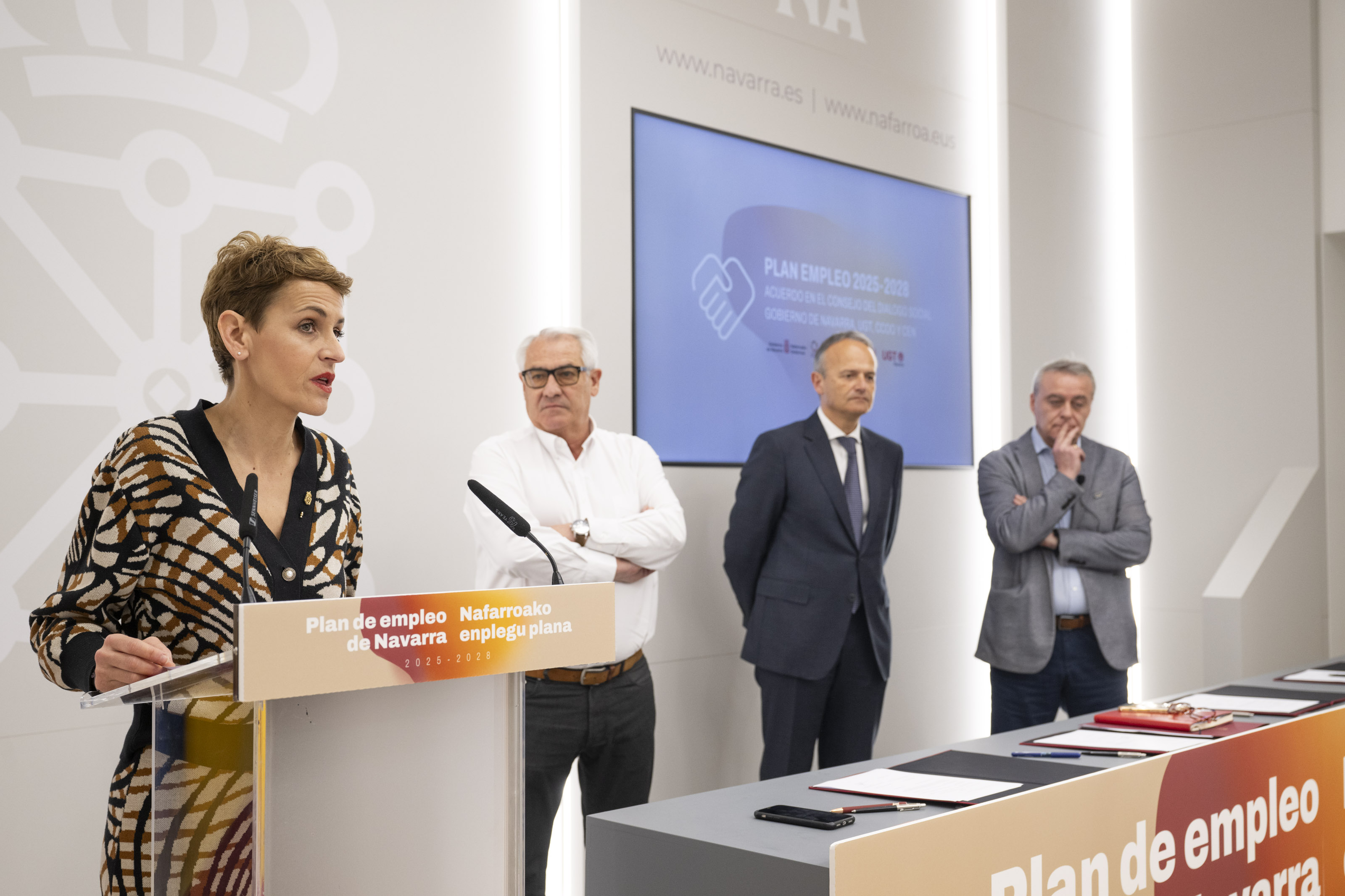 La Presidenta de Navarra, María Chivite Navascués, ha firmado esta mañana el nuevo Plan de Empleo de Navarra 2025-2028 con el presidente de la Confederación Empresarial Navarra (CEN), Manuel Piquer, el secretario general de UGT, Jesús Santos, y Alfredo Sanz, secretario de Acción Sindical de CCOO de Navarra.