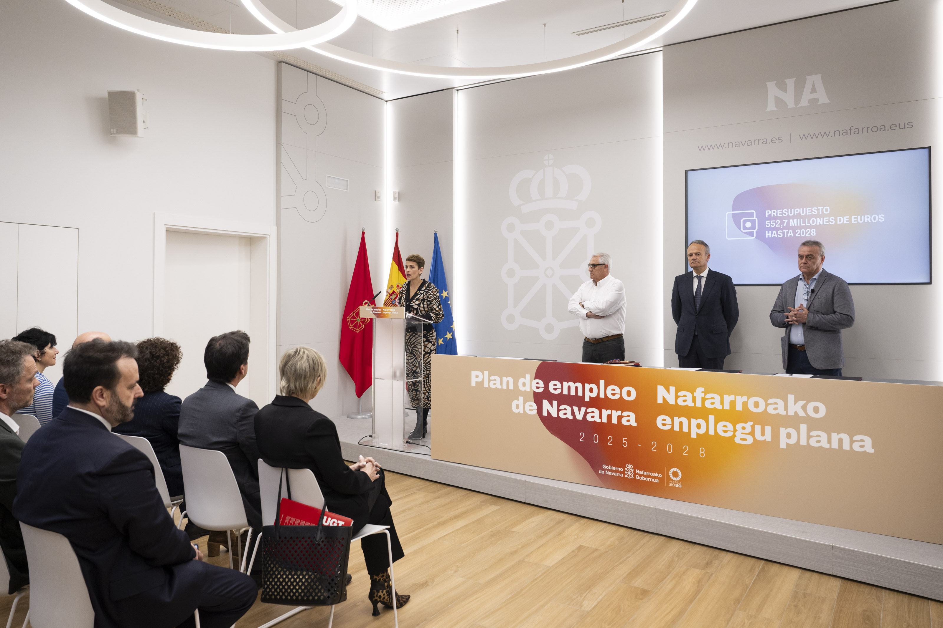 La Presidenta de Navarra, María Chivite Navascués, ha firmado esta mañana el nuevo Plan de Empleo de Navarra 2025-2028 con el presidente de la Confederación Empresarial Navarra (CEN), Manuel Piquer, el secretario general de UGT, Jesús Santos, y Alfredo Sanz, secretario de Acción Sindical de CCOO de Navarra. El Gobierno de Navarra destinará un total de 552,7 millones de euros a este nuevo plan. La inversión será de 132,96 millones este año; 135,92 millones en 2026; 140,63 en 2027 y 143,24 en 2028. Por áreas, la mayor parte del presupuesto del plan, 276,18 millones, será para el fomento de la competitividad y el crecimiento de las pymes. En segundo lugar, el área con mayor presupuesto son las Políticas Activas de Empleo, con 269,1 millones. Por otro lado, la inversión en acciones para atajar la siniestralidad será de 4,8 millones y se destinarán otros 2,7 millones a la transversalidad de género y las relaciones laborales.