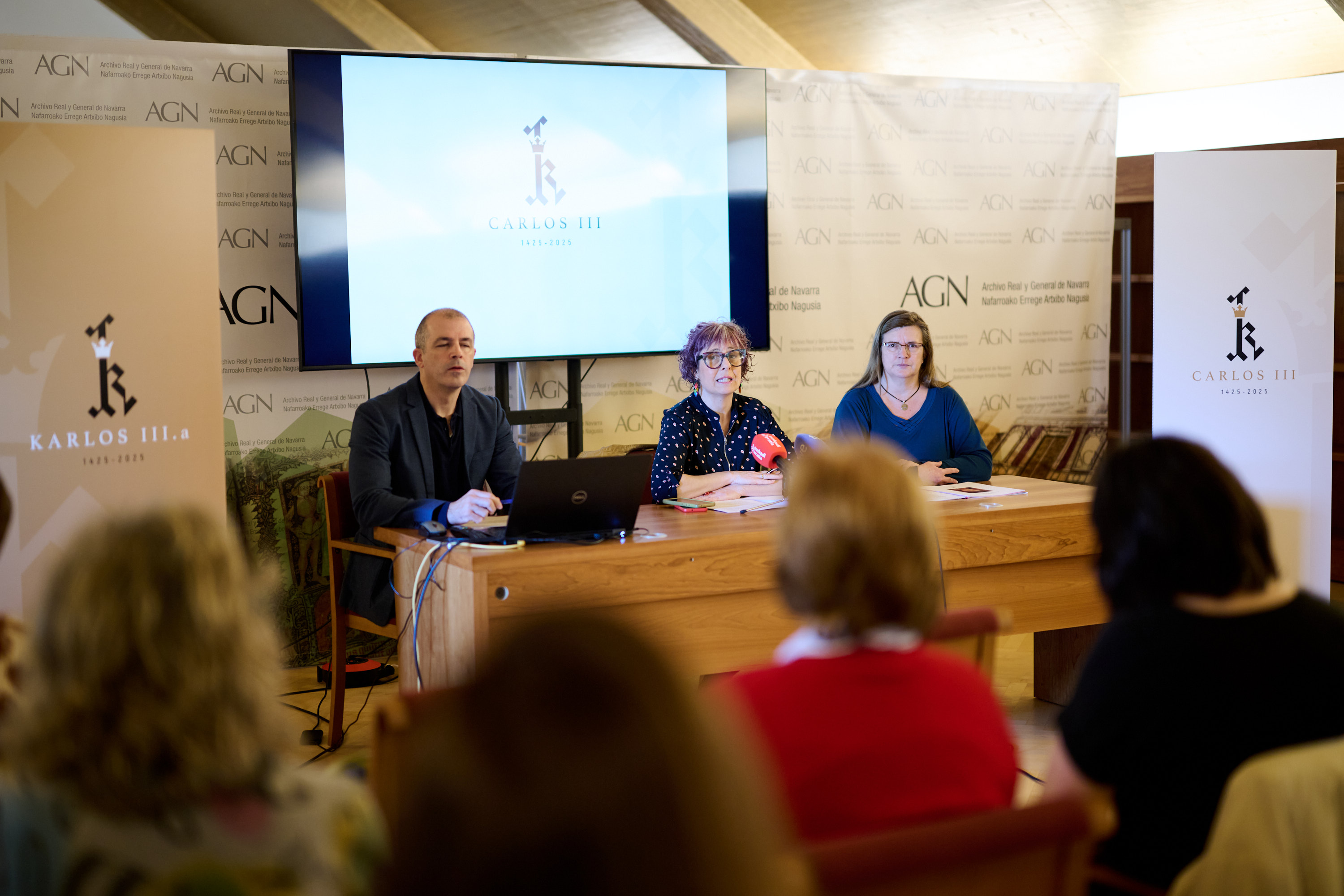 La consejera ha presentado, también, el logotipo que se ha creado para el programa, obra del diseñador gráfico Jose Miguel Parra, y que recrea la letra inicial del nombre del monarca Carlos III en la escritura gótica característica de los documentos de la cancillería real navarra.