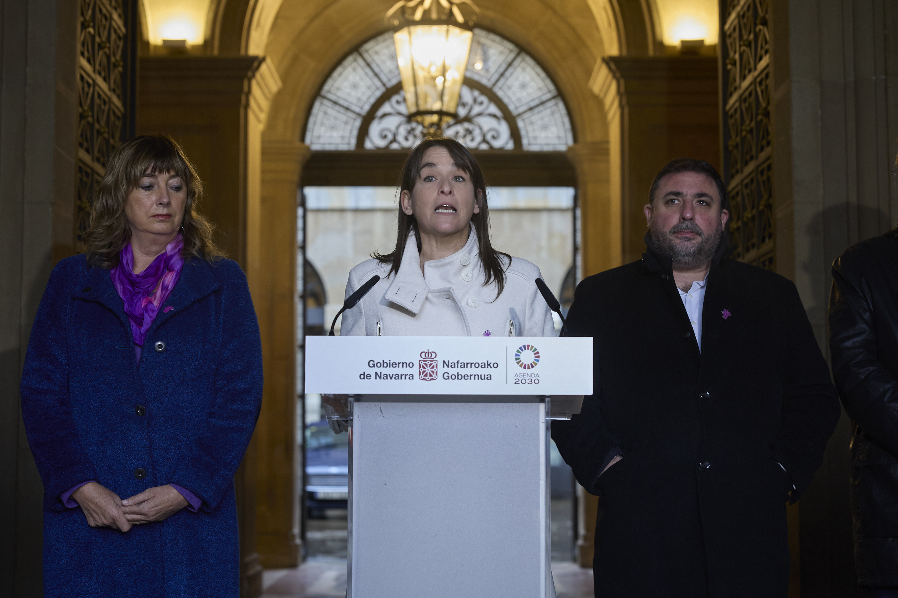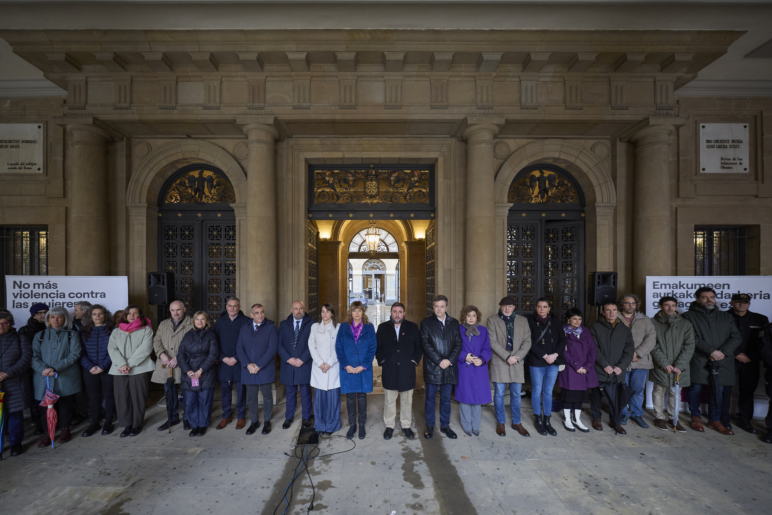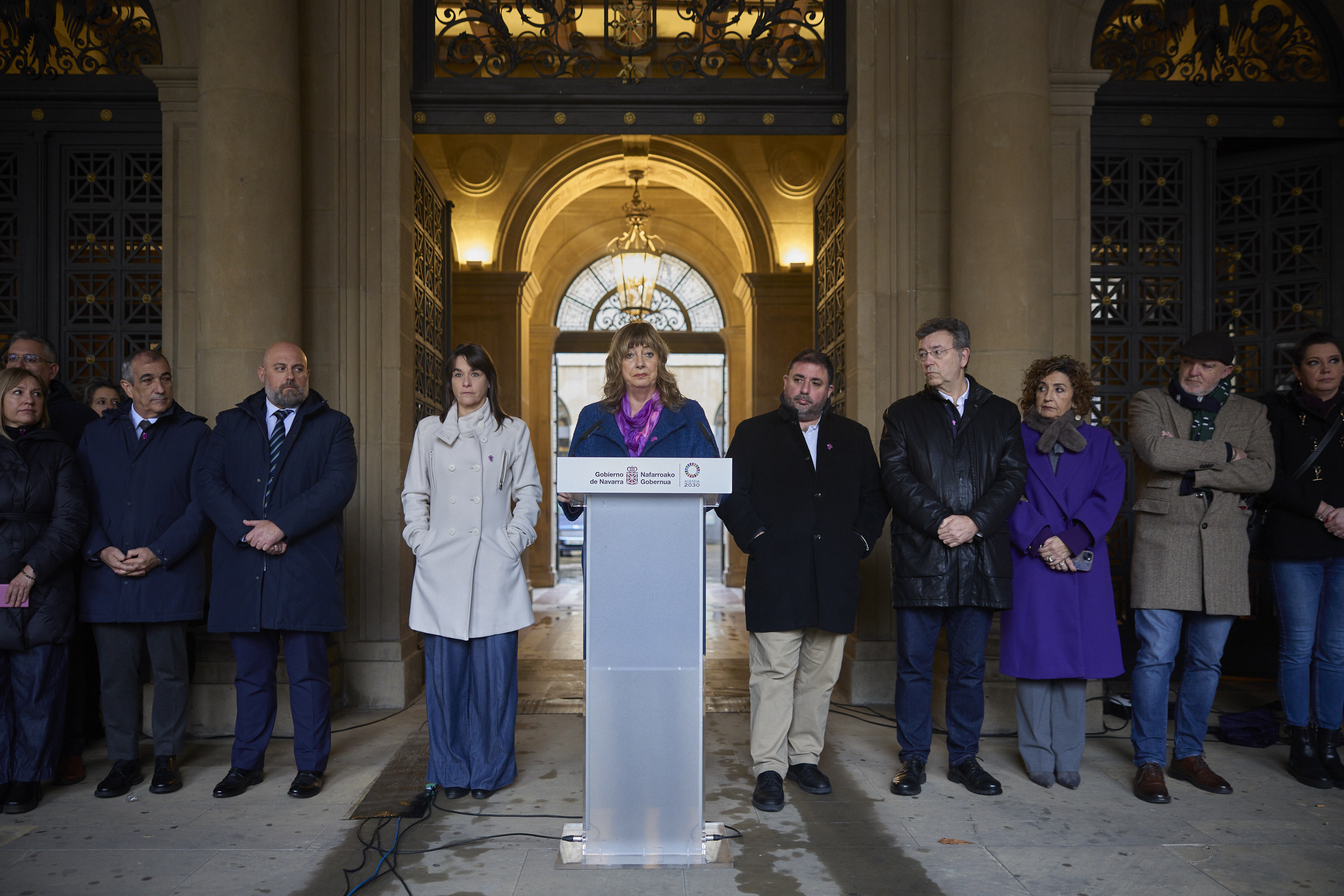 El presidente del Parlamento de Navarra, Unai Hualde, junto con integrantes del Ejecutivo foral han encabezado una concentración celebrada frente al Palacio de Navarra con motivo del 25N. La vicepresidenta segunda y consejera de Memoria, Convivencia, Acción Exterior y Euskera, Ana Ollo, y la vicepresidenta tercera y consejera de Vivienda, Juventud y Políticas, Begoña Alfaro, han leído la declaración institucional aprobada por el Gobierno de Navarra con motivo de esta jornada reivindicativa, en sus versiones en euskera y castellano, respectivamente.