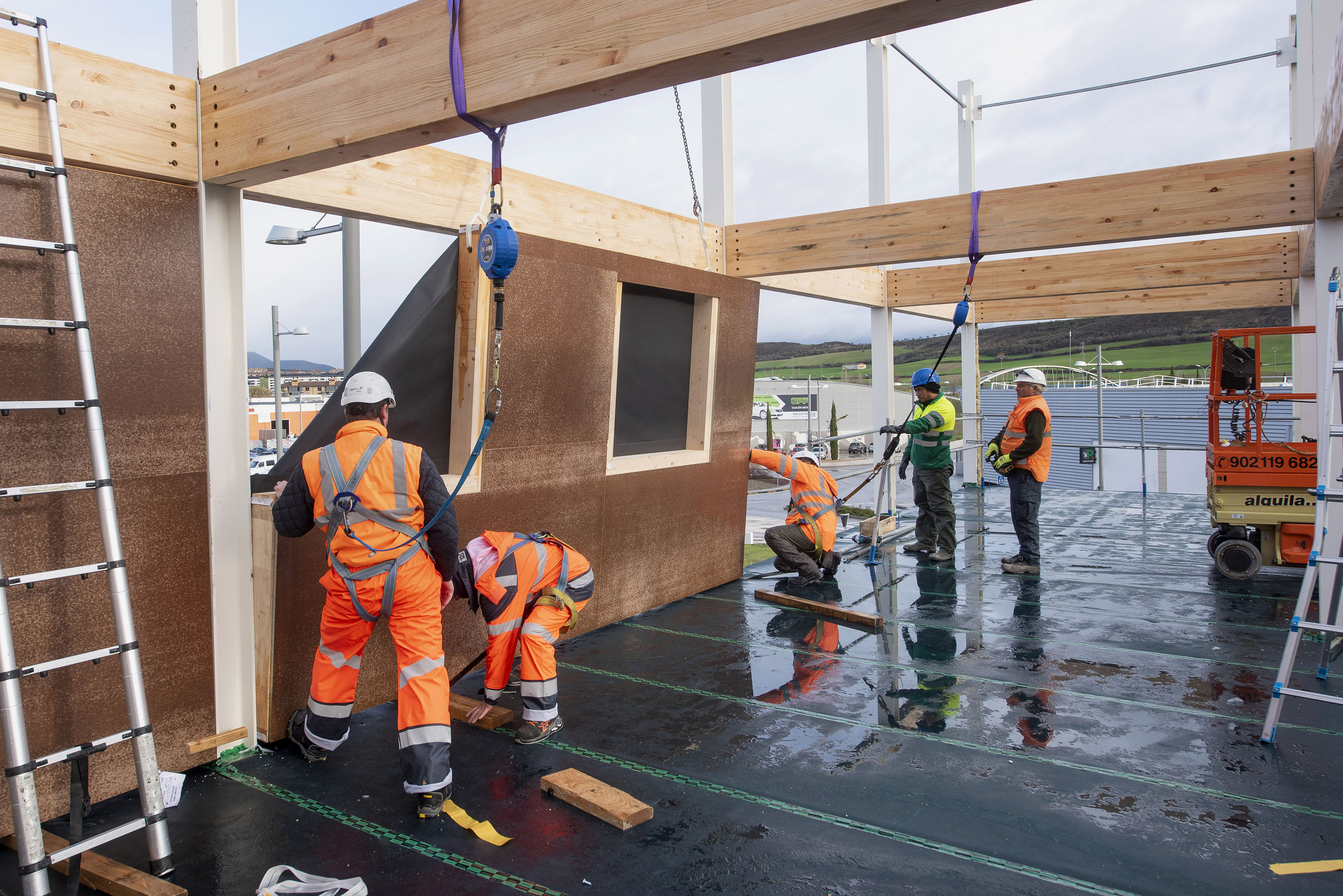 El consejero Aierdi ha participado hoy, junto con equipos de arquitectura especializados, la dirección de obra, representantes de la industria maderera navarra y personal técnico del proyecto europeo Eguralt que lidera Nasuvinsa, en una sesión técnica destinada a certificar y analizar, in situ y desde los cimientos y el esqueleto mismo del edificio, los detalles de todo el proceso que implica una construcción en altura a partir de una estructura y cubiertas de madera, como modelo alternativo al hormigón y al ladrillo.