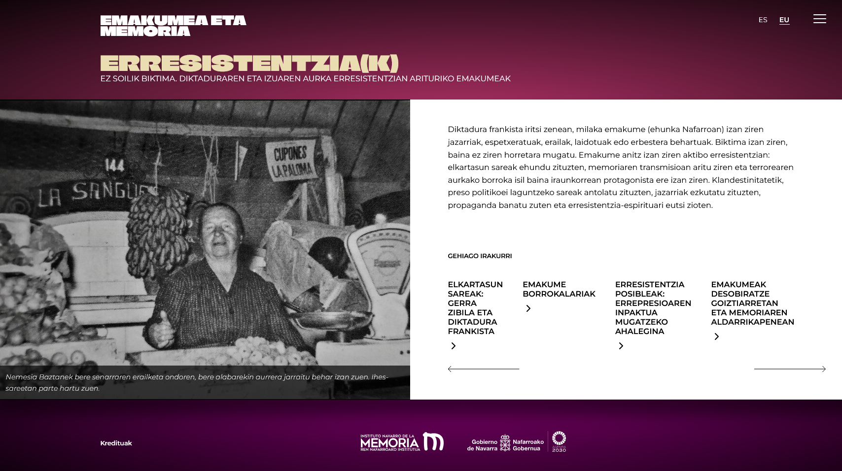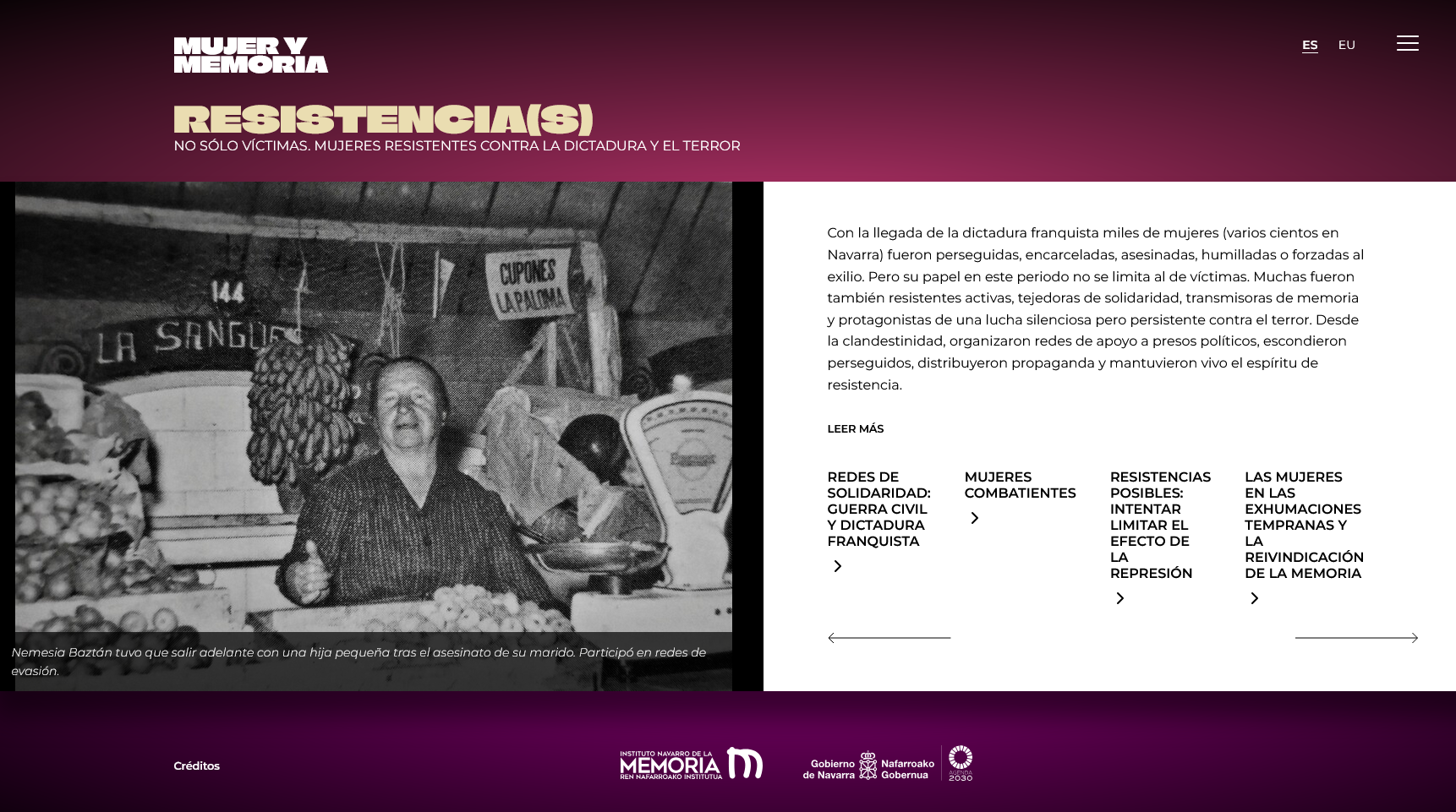 Por último, en el ámbito Resistencia(s), se da cuenta de algunas realidades poco conocidas: la participación de mujeres en las redes de solidaridad, creadas tanto en la guerra como en la dictadura, para ayudar a cruzar la frontera a quienes querían huir; las mujeres navarras que en zona leal combatieron contra los sublevados; las resistencias cotidianas para intentar limitar el efecto de la represión; y el papel desempeñado por las mujeres en la reivindicación de la memoria, con especial atención a las exhumaciones tempranas de la Transición.