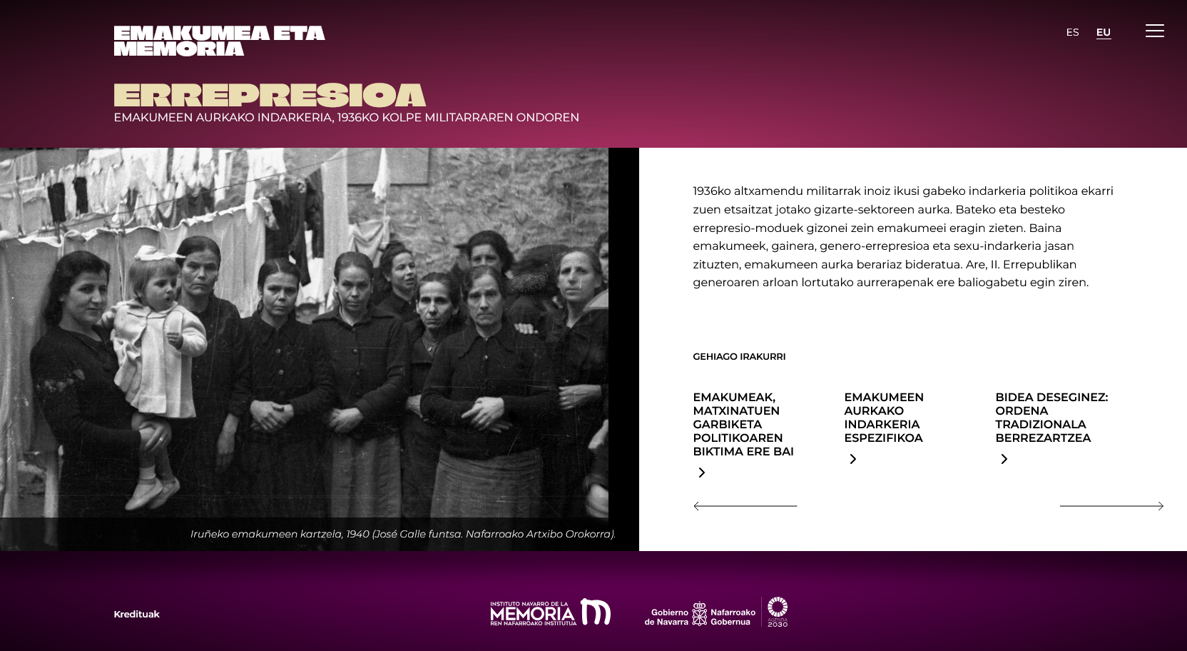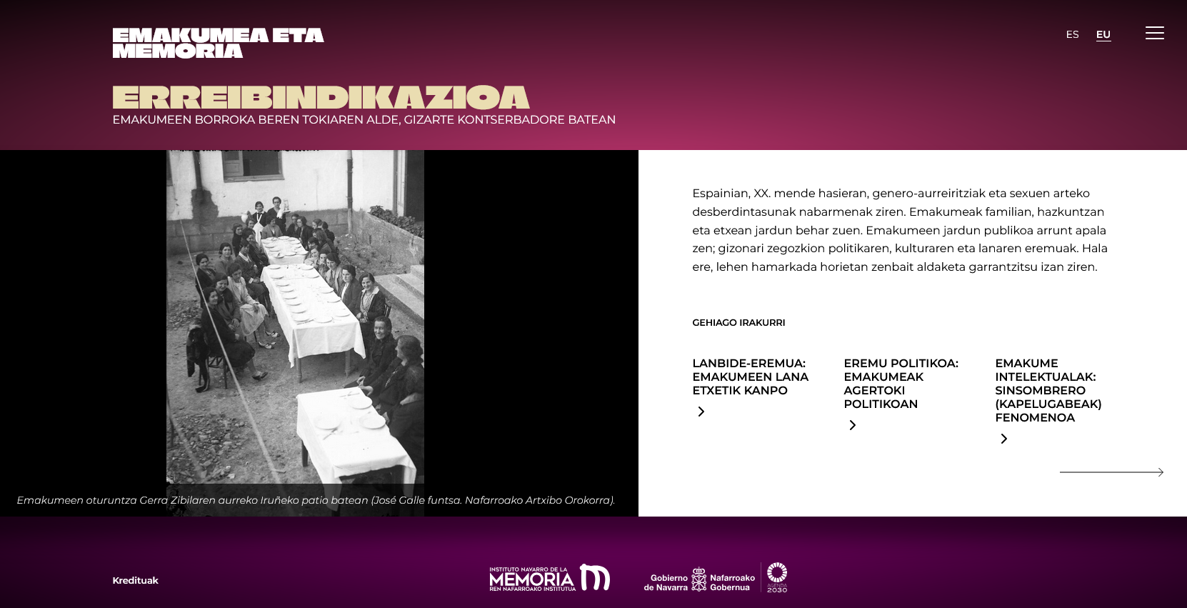 El Departamento de Memoria y Convivencia, Acción Exterior y Euskera del Gobierno de Navarra, a través del Instituto Navarro de la Memoria y la Dirección General de Memoria y Convivencia, ha presentado hoy la exposición virtual ‘Mujer y Memoria’, accesible desde el archivo digital Oroibidea. Este proyecto pretende acercar a la ciudadanía y, en especial, a las generaciones más jóvenes, el papel desempeñado por las mujeres en la sociedad navarra del primer tercio del siglo XX, bruscamente interrumpido por el terror desatado tras el golpe militar de 1936. En este sentido, Mujer y Memoria pretende ser un portal de la memoria de las mujeres represaliadas y resistentes, que albergue tanto proyectos ya publicados como otros que se vayan elaborando en el futuro.