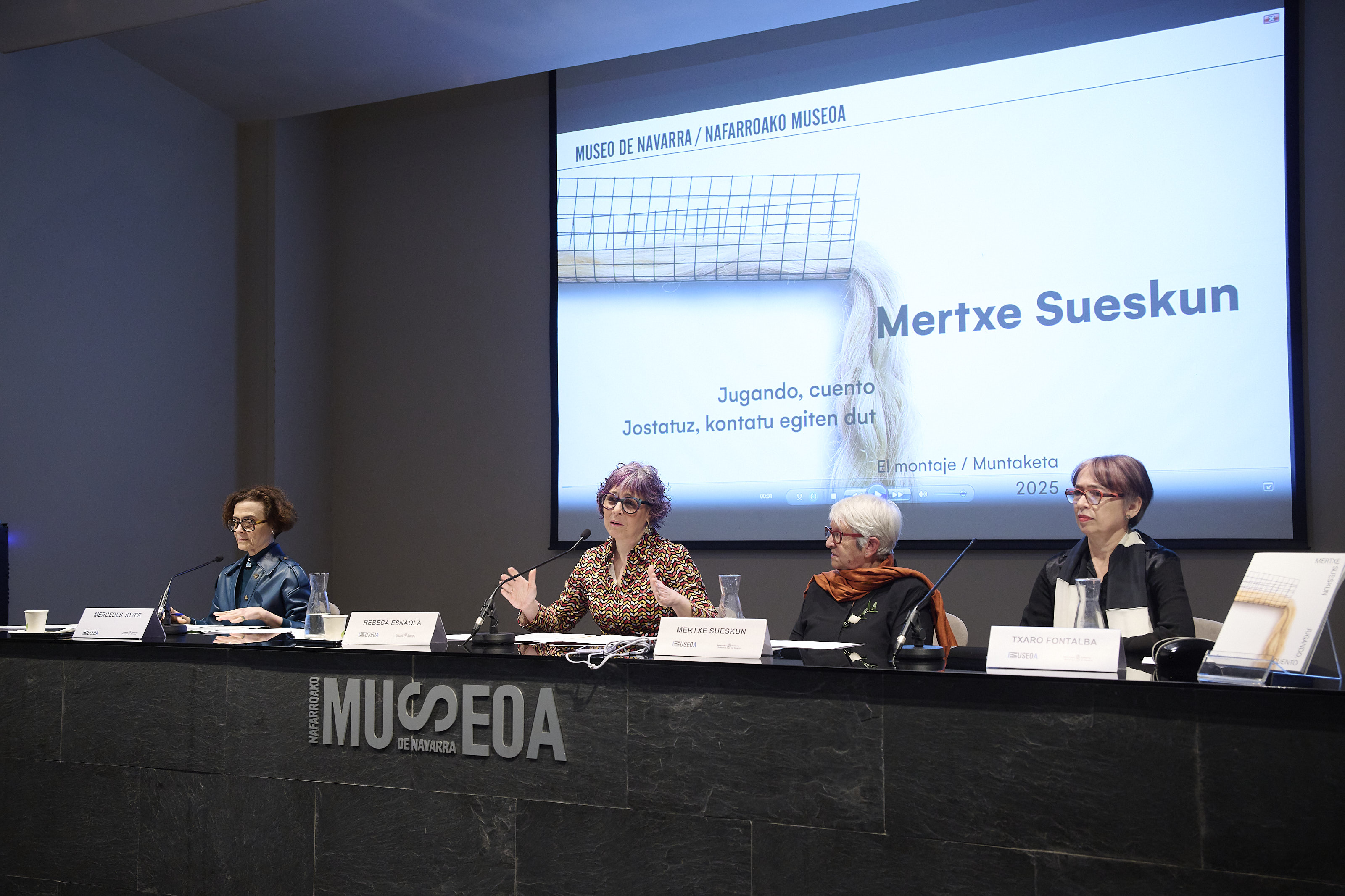 La consejera de Cultura, Deporte y Turismo, Rebeca Esnaola, ha presentado hoy en el Museo de Navarra la exposición 'Mertxe Sueskun. Jugando, cuento / Jostatuz, kontatu egiten dut', que, comisariada por la también escultora Txaro Fontalba, recoge una muestra de cerca de 60 obras realizadas por la artista entre la década de los 80 y la actualidad.