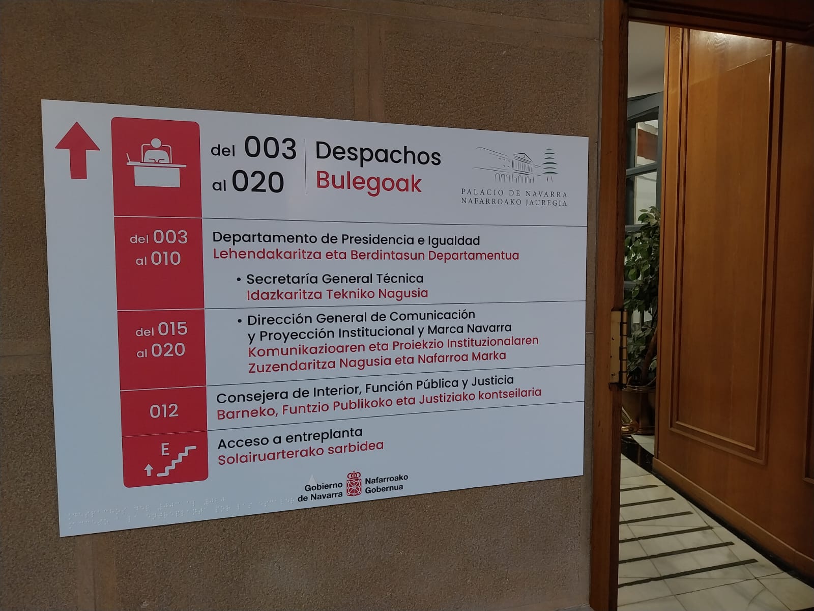 El edificio del Palacio de Navarra, sede del Gobierno de Navarra, avanza en accesibilidad universal con la reciente instalación de una señalética interior accesible para todas las personas. Se trata de una medida contemplada en el Plan Operativo de Accesibilidad Universal para este 2025.