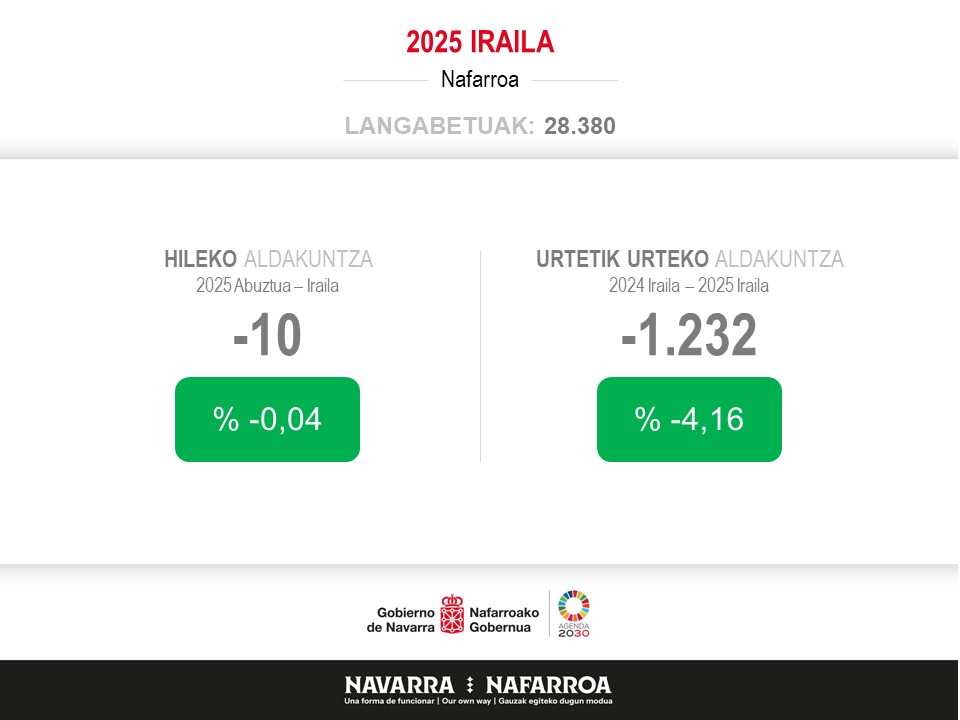 El paro se reduce en Navarra en 1.232 personas y la afiliación crece en 4.537 personas trabajadoras el último año