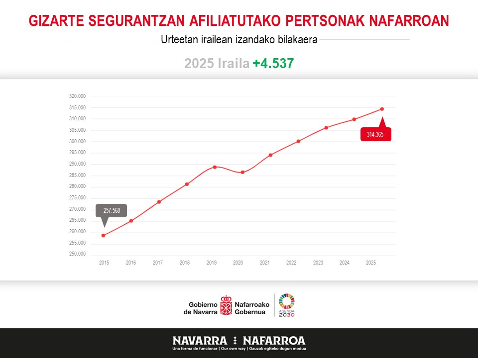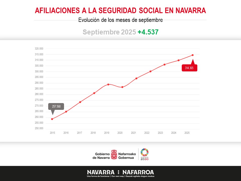 Respecto a la afiliación, el descenso mensual del -0,23% supone 720 afiliaciones menos en un mes. Además, en un año se produce un incremento de la afiliación media del +1,46%, lo que supone 4.537 afiliaciones más. En definitiva, Navarra continua en niveles históricos de empleo. De hecho, las 314.365 afiliaciones suponen la quinta cifra más alta de la serie histórica.