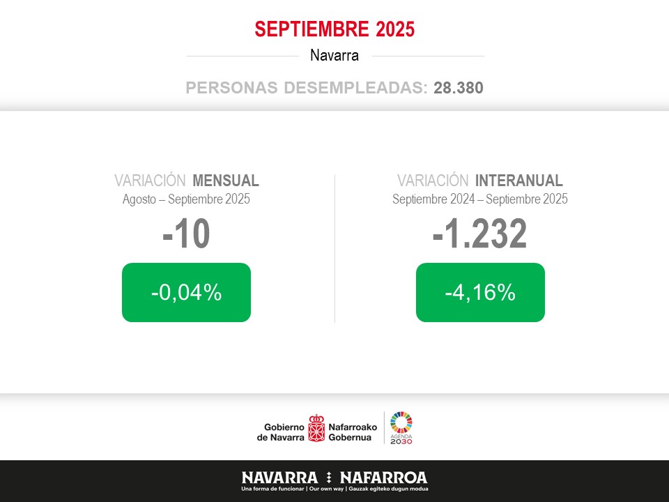 En un año, se produce una bajada del desempleo en seis de las ocho agencias. Los aumentos del paro han sido los siguientes: en la agencia de Alsasua se ha dado un incremento del paro del +2,9% respecto a septiembre de 2024, se trata de 21 personas paradas más, mientras que en la de Santesteban el incremento ha sido de un +2,8% (15 personas paradas más). Por el contrario, en la de Estella-Lizarra ha bajado un -6% (102 personas menos), en la de Lodosa -5,7% (67 menos), en Pamplona / Iruña -5% (904 menos), en Aoiz -4,5% (31 menos), en la de Tafalla -3,4% (64 menos), y finalmente Tudela con un descenso interanual del -2,1% (100 personas menos).
