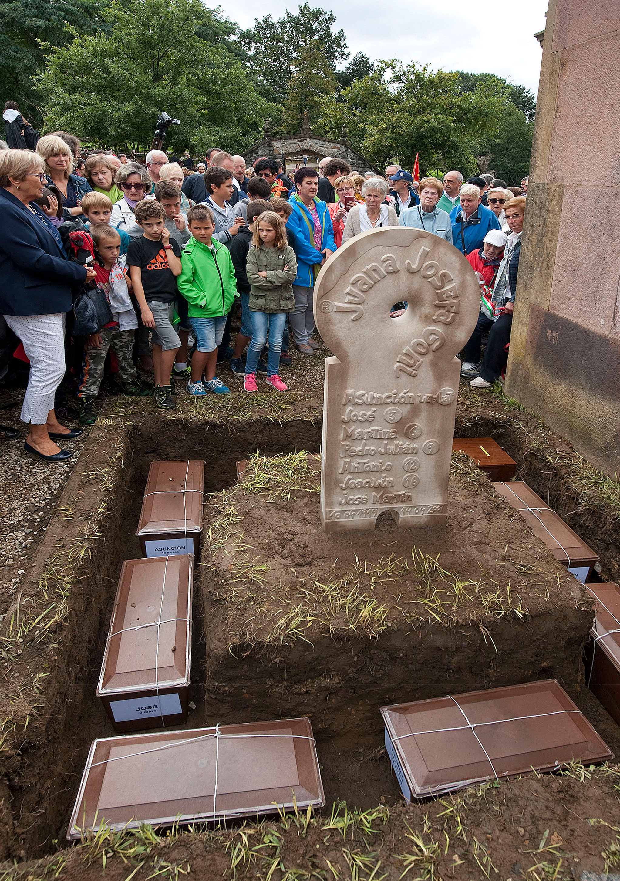 Tras el hallazgo estos últimos meses en la sima de Legarrea de los cuerpos de Juana Josefa Goñi Sagardía y seis de sus siete hijos desaparecidos en el contexto de la guerra civil, hoy se ha celebrado en la sima, a las 10.30 horas, el acto de inauguración de un monolito en recuerdo de estos hechos. Posteriormente, ha tenido lugar en la Plaza de Gaztelu, en presencia de la consejera de Relaciones Ciudadanas e Institucionales, Ana Ollo, representantes municipales y vecinos, la entrega a los familiares de los restos mortales, acto en el que también ha estado presente la consejera de Desarrollo Rural, Medio Ambiente y Administración Local Isabel Elizalde.