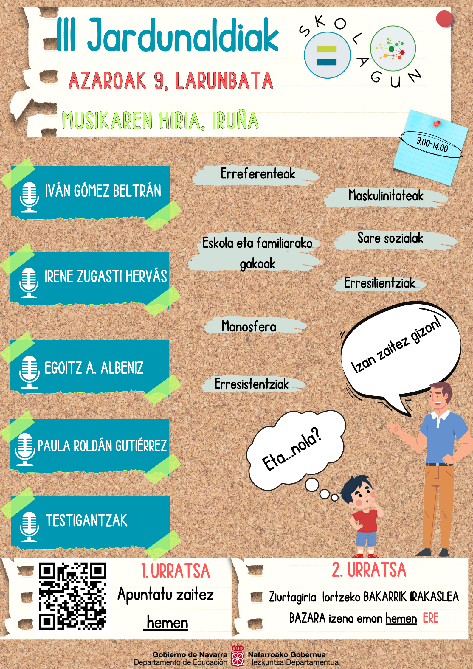 La jornada, que se llevará a cabo en la Ciudad de la Música de Pamplona el sábado 9 de noviembre, contará con ponencias que correrán a cargo de Irene Zugasti, politóloga, periodista y máster en Relaciones Internacionales, que abordará el impacto de la manosfera (la red de sitios web, blogs y foros en línea que promueven la masculinidad enfatizada, la hostilidad hacia las mujeres o la misoginia) en las relaciones interpersonales; Paula Roldán, psicóloga formadora en igualdad, violencia de género y buenos tratos, especializada en adolescencia y juventud y docente colaboradora en intervención psicológica con víctimas de violencia de género, que hablará del impacto de la manosfera en el cuerpo y en la construcción de la identidad desde la corporeidad; Egoitz Arbiol, antropólogo social, educador, cofundador de la asociación Hiruki Larroxa Kolektiboa y coautor del libro ‘¿Cuándo se acaba el armario?´, cuya intervención se va a centrar en la facilitación como clave para el trabajo de la reacción antifeminista en las aulas; e Iván Gómez Beltrán, doctor en Género y Diversidad, investigador y formador en igualdad, masculinidades y colectivo LGTBIA+, además de coordinador del área de formación y divulgación de XEGA de Asturias, que intervendrá sobre la complicidad masculina como núcleo machista y su impacto en las aulas.