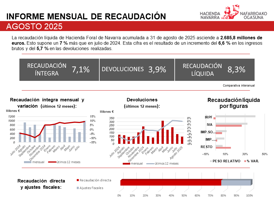 La recaudación líquida de la Hacienda Foral de Navarra acumulada hasta el mes de agosto ascendía a 3.594,5 millones de euros frente a los 3.319,2 millones de euros ingresados hasta el mismo mes del año 2024. Esta cifra representa un incremento del 8,3% en términos interanuales, y fue resultado de un incremento de la recaudación íntegra acumulada del 7,1% y de un aumento de las devoluciones acumuladas del 3,9%.