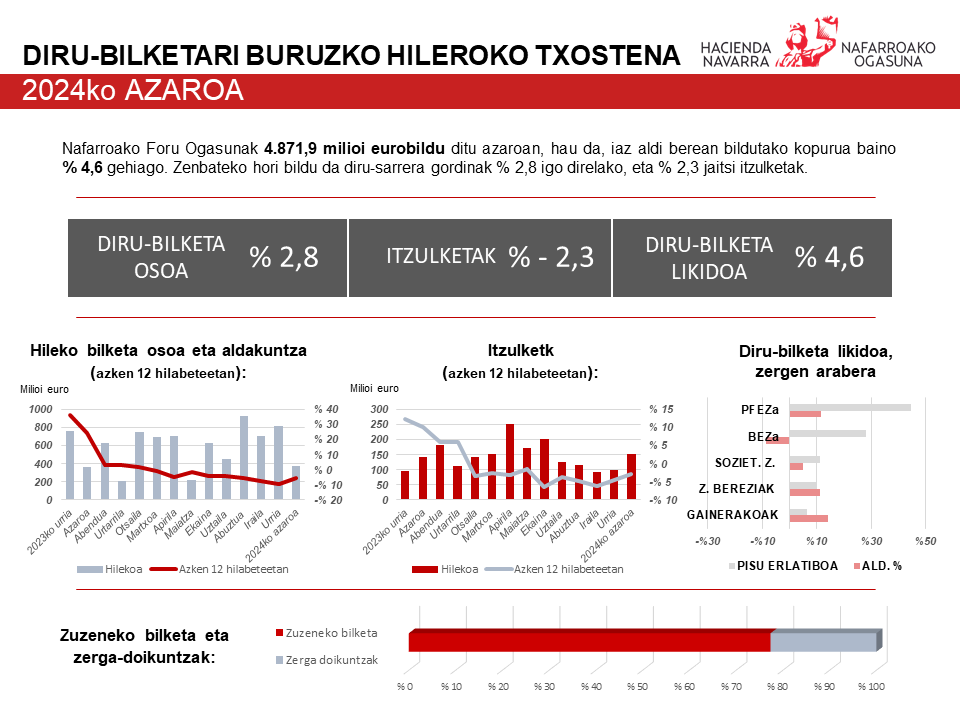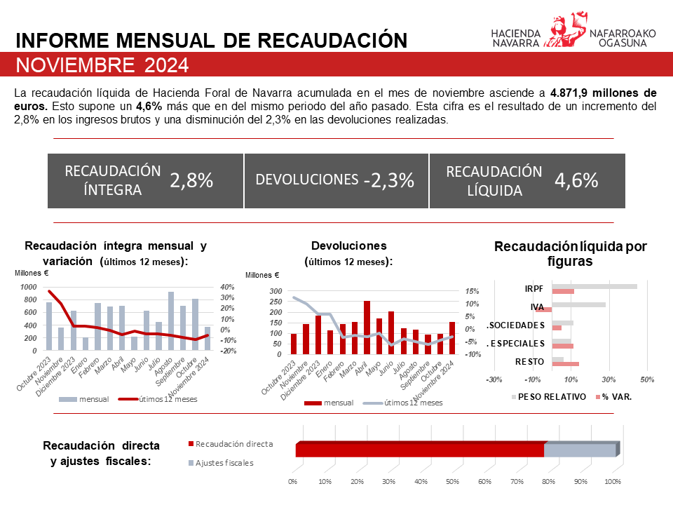 La recaudación acumulada de Hacienda Foral de Navarra alcanzaba en el mes de noviembre los 4.871,9 millones de euros frente a los 4.659 millones ingresados el mismo mes de 2023. Este incremento del 4,6 % interanual es consecuencia de un aumento en la recaudación íntegra acumulada del 2,8 % y de una disminución del 2,3 % en las devoluciones.