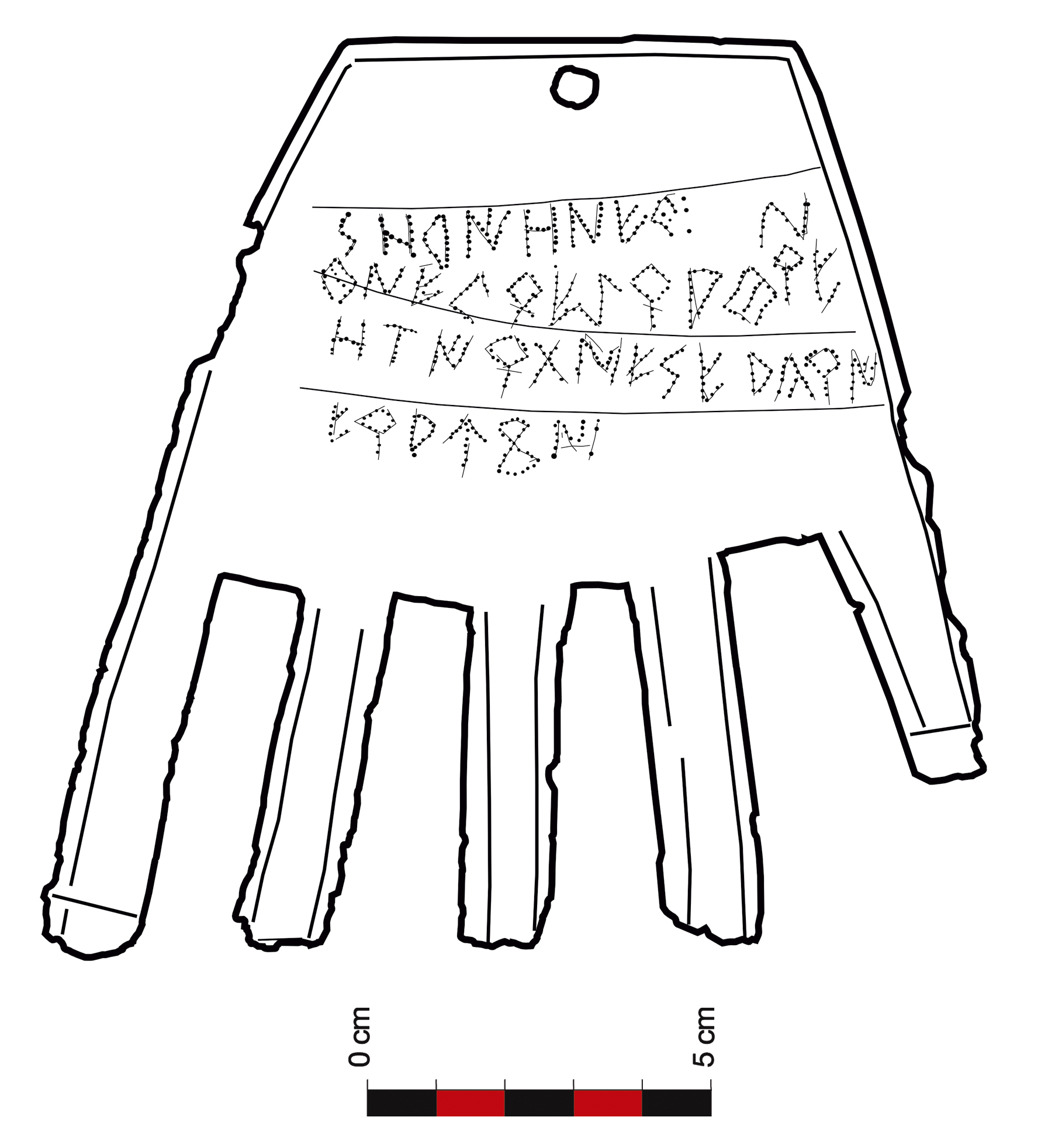 El testimonio supone también una singularidad por lo que respecta a la tipología y morfología del soporte (una mano clavada con los dedos hacia abajo) y a la técnica inscriptoria empleada (punteado después de un esgrafíado).