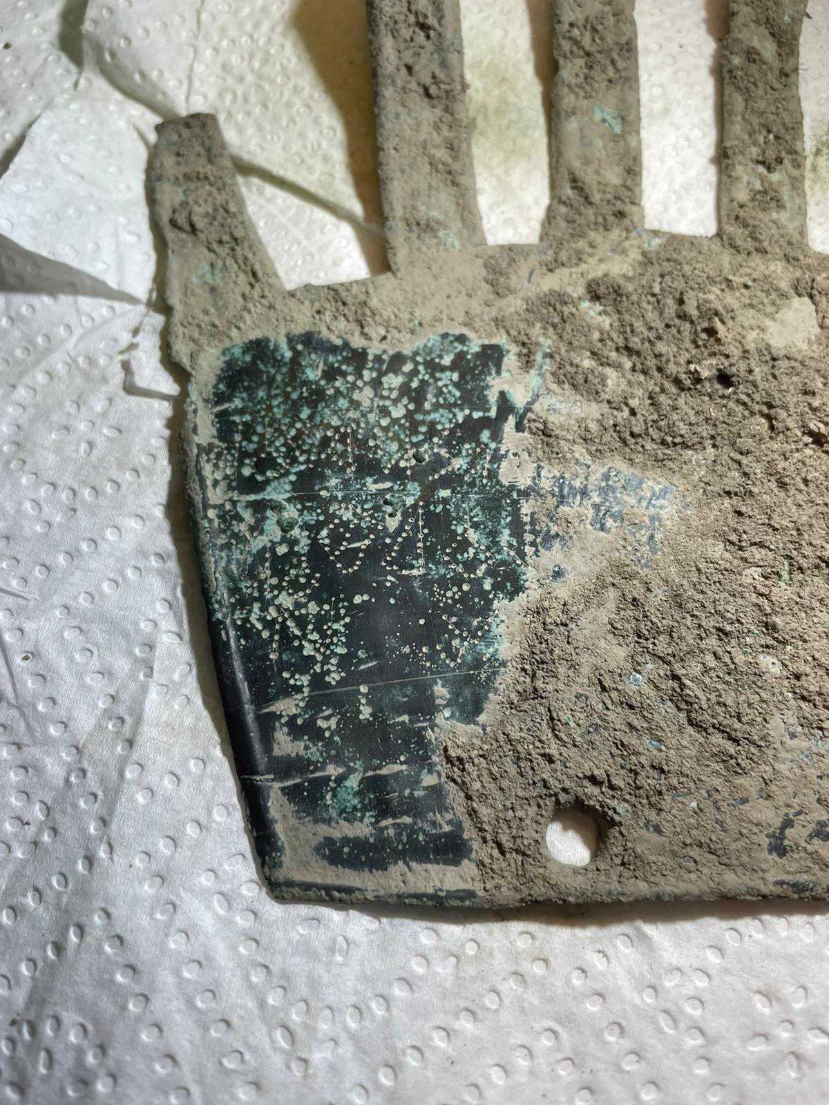 En el centro del extremo cercano a la muñeca presenta una perforación de 6,51 mm de diámetro, producida al clavar la pieza en un soporte blando, probablemente de madera, ya que la ausencia de huellas de abrasión en la perforación indica que no estuvo colgada, sino clavada.