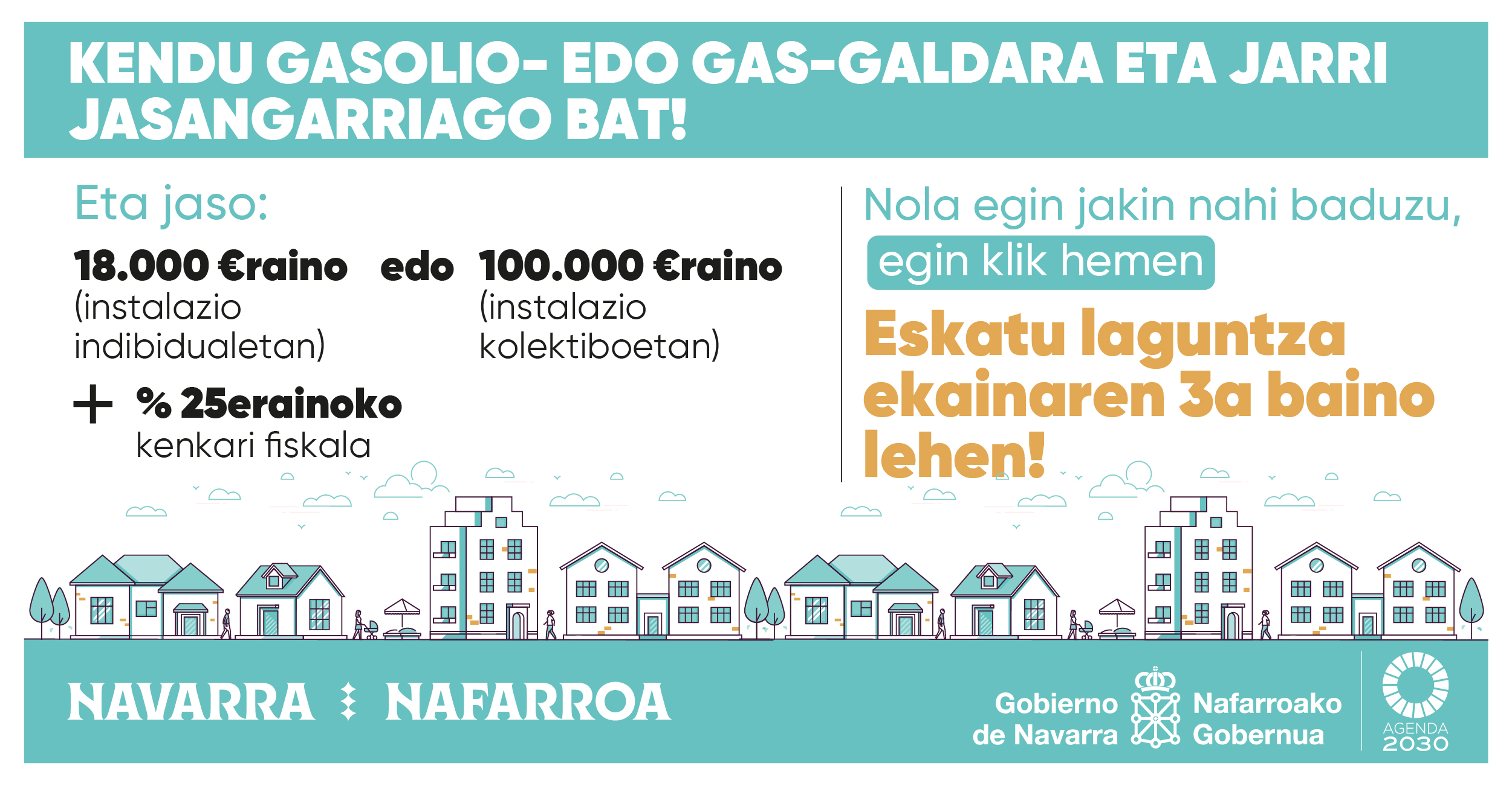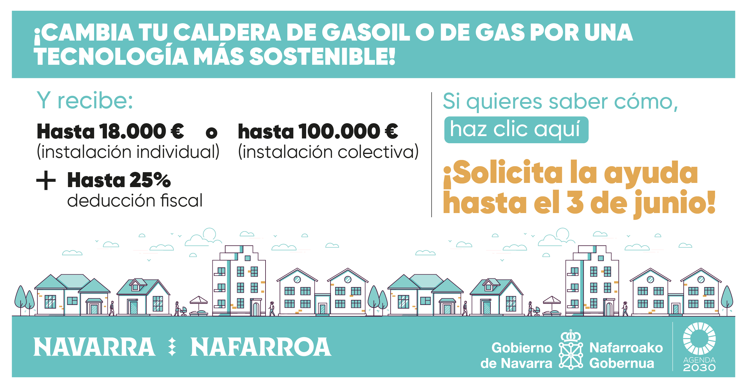 Con el lema “¡Cambia tu caldera de gasoil o de gas por una tecnología más sostenible!” se pretende que la ciudadanía que tenga una caldera de gasoil, de gas u otros, conozca las posibilidades de sustitución por aquellas que generan menos contaminación como son las de biomasa, la solar térmica, la aerotermia, la geotermia o la hidrotermia. El coste del cambio será subvencionado por el Gobierno de Navarra con hasta 18.000 euros en el caso de calderas individuales; y con hasta 100.000 euros, si se trata de calderas comunitarias.