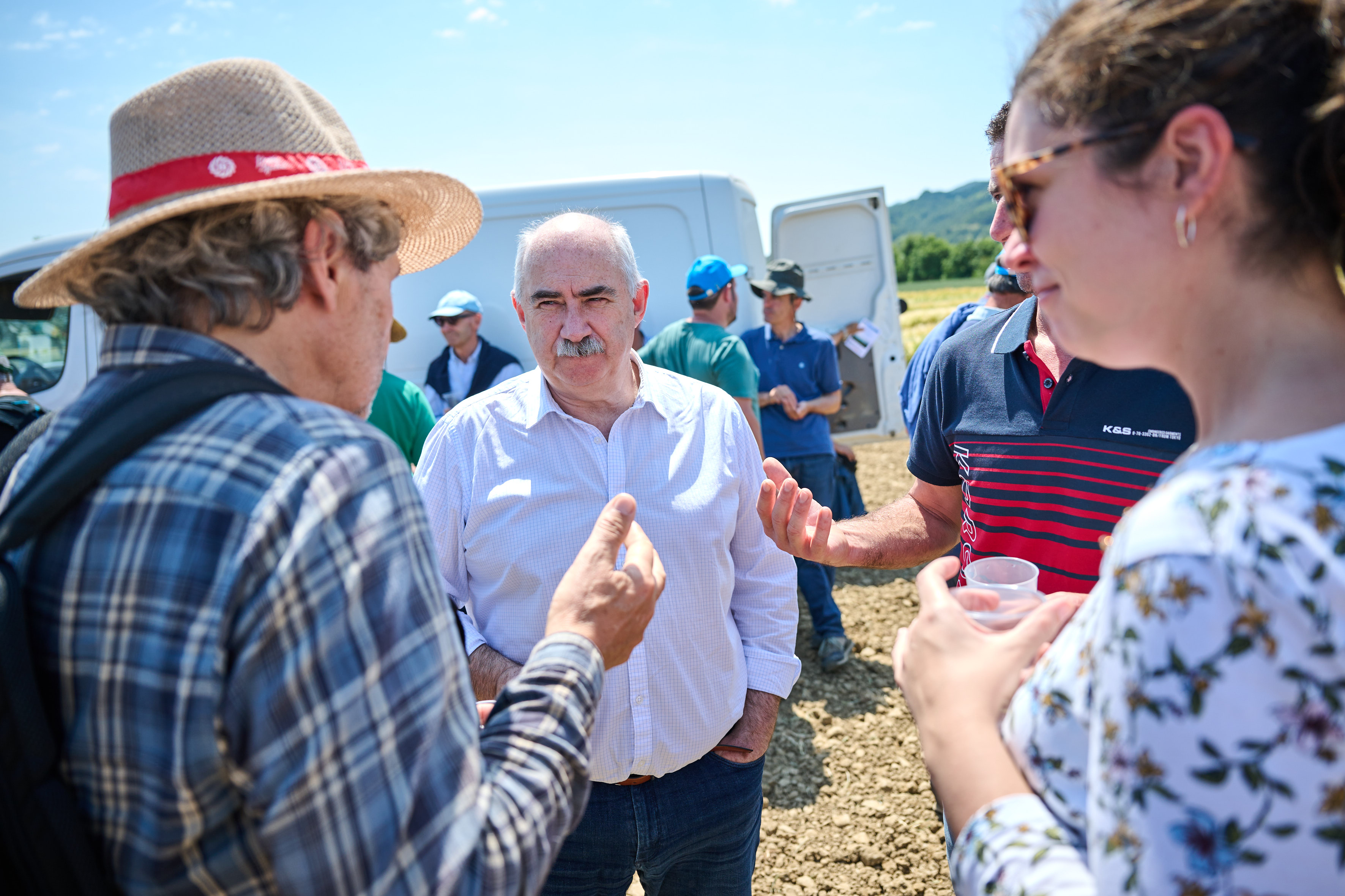 El consejero de Desarrollo Rural y Medio Ambiente, Jose Mª Aierdi, y la directora gerente de INTIA, Natalia Bellostas, se han acercado hasta este campo de ensayos para participar de esta jornada de puertas abiertas que ha contado con un centenar de asistentes. El objetivo de estas visitas es que los y las profesionales del sector puedan conocer, de primera mano, la labor investigadora que se está llevando a cabo en estas parcelas.