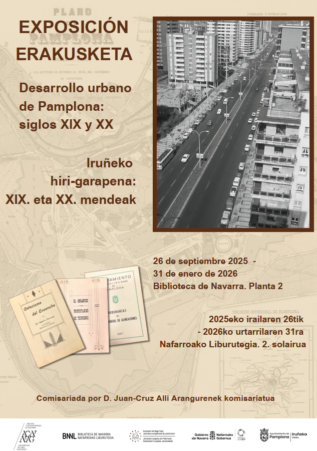 Al igual que en años anteriores, la Biblioteca de Navarra se suma a la celebración de las Jornadas Europeas del Patrimonio y lo hace con varias actividades, entre las que cabe destacar la exposición ‘Desarrollo urbano de Pamplona: siglos XIX y XX’, comisariada por Juan-Cruz Alli, que podrá verse en la planta 2 desde el 26 de septiembre hasta el 31 de enero de 2026. Además, el propio Alli ofrecerá, el lunes 29 a las 19:00, en la Sala de Proyecciones, una charla en torno al tema de la exposición.
