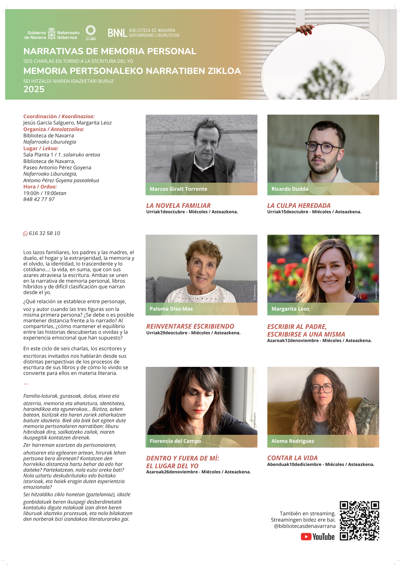 El 1 de octubre arranca un nuevo ciclo literario, ‘Narrativas de memoria personal. Seis charlas en torno a la escritura del yo’, que se extenderá hasta el mes de diciembre y está coordinado por Margarita Leoz y Jesús García Salguero. La primera cita será con Marcos Giralt Torrent quien hablará sobre ‘La novela familiar’; la segunda, el 15 de octubre, con Ricardo Dudda en torno a ‘La culpa heredada’ y la tercera, con Paloma Díaz-Más y ‘Reinventarse escribiendo’.