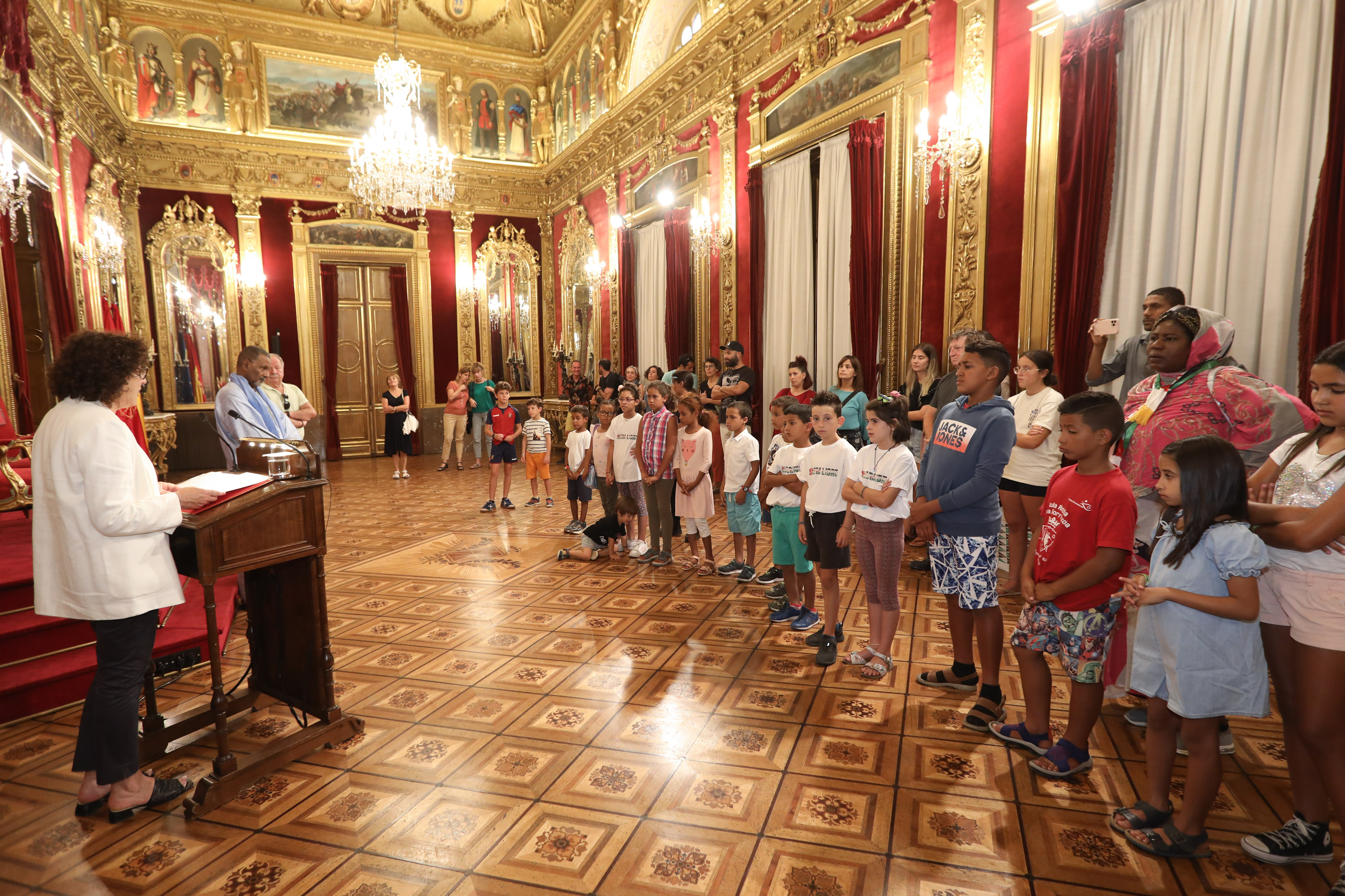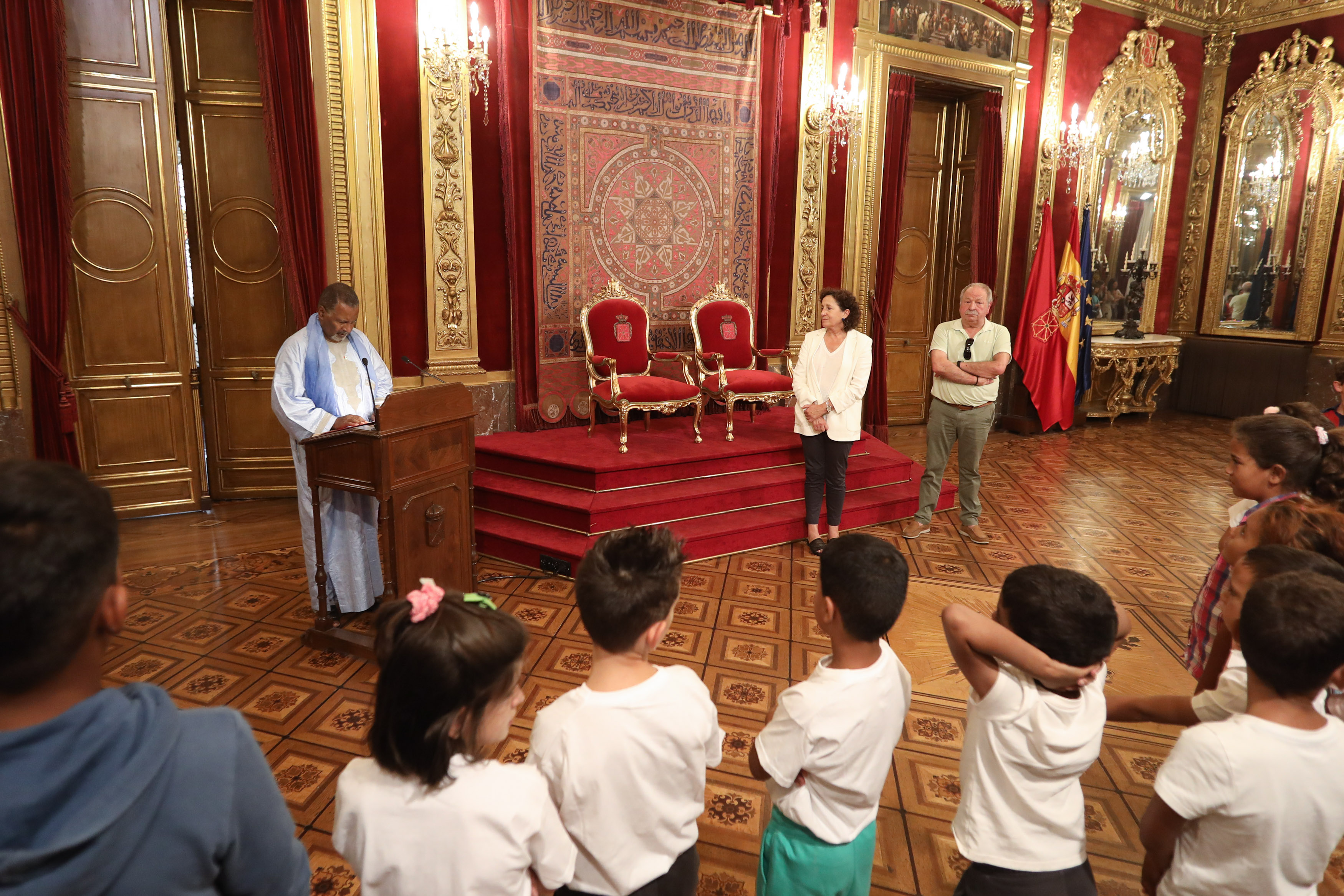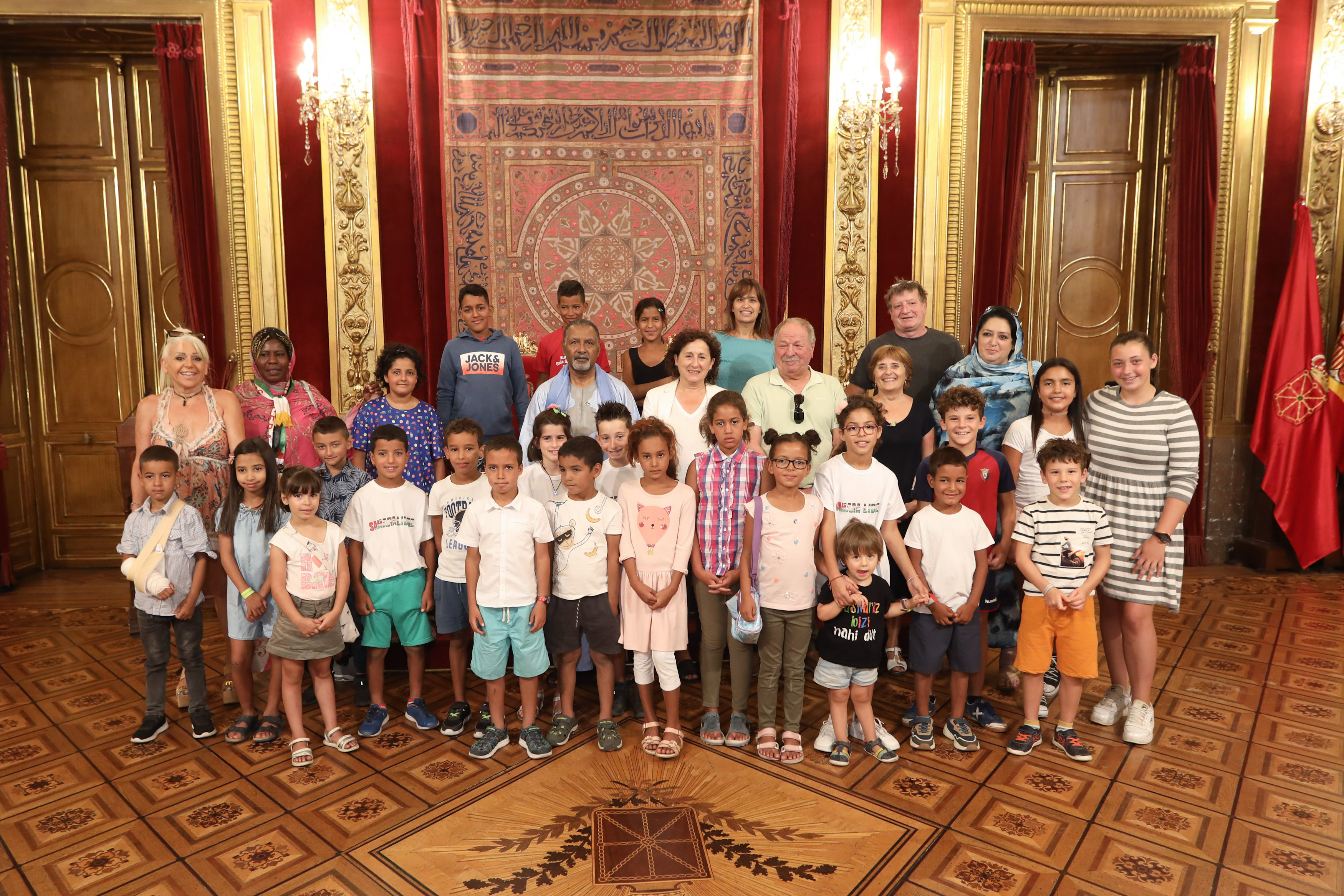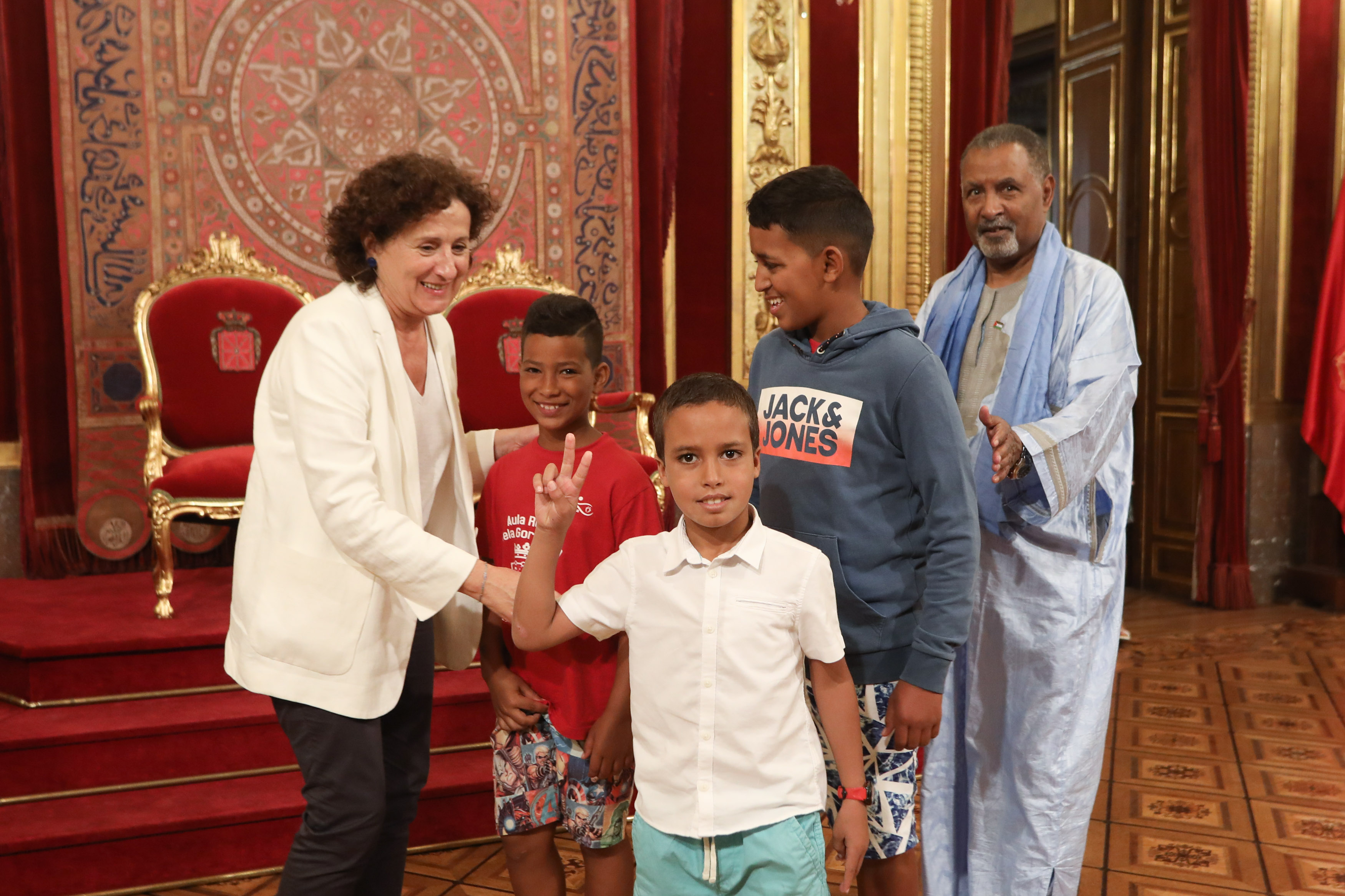 La consejera de Derechos Sociales, Mª Carmen Maeztu, ha recibido este mediodía a una representación de los y las 63 menores saharauis que pasan el verano con familias navarras gracias al programa Vacaciones en Paz, promovido por la Asociación Navarra de Amigos del Sahara (ANAS) y la Delegación Saharaui en Navarra, que se retoma este 2022 tras dos años de parón debido a la pandemia de COVID-19.