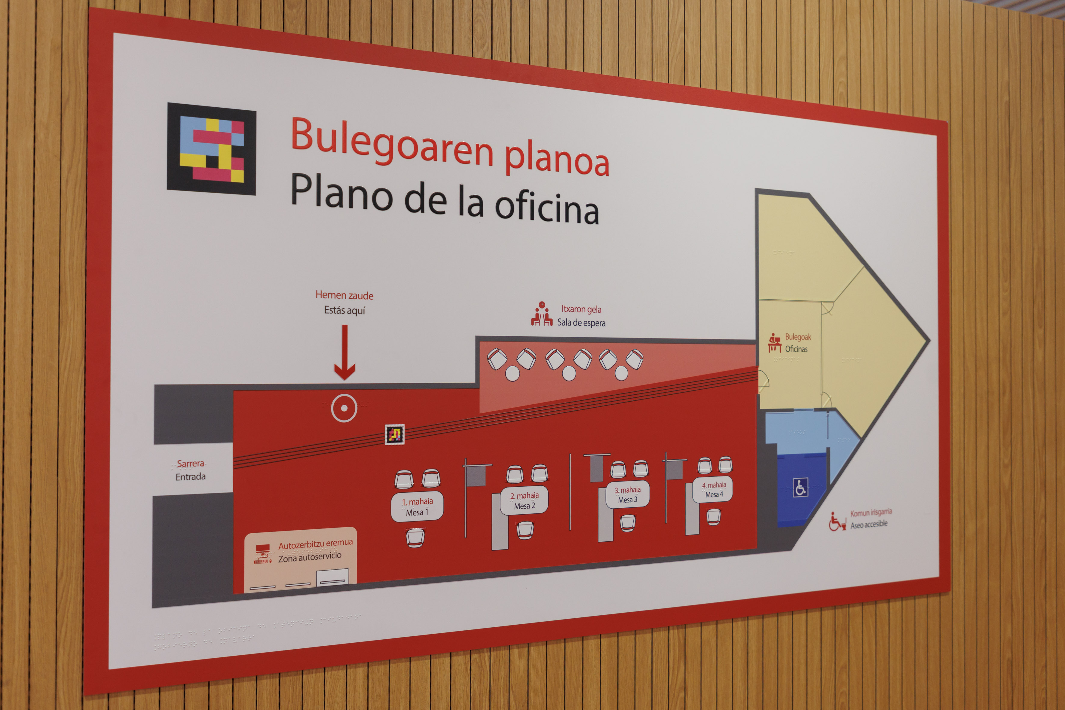 En lo relativo a su diseño, la pavimentación del suelo es de color rojo, y simula una alfombra roja para el acceso de la ciudadanía, como muestra de la filosofía de cercanía y servicio del Gobierno de Navarra en materia de atención ciudadana, con la pretensión de crear un espacio de confianza, cercano y confortable.