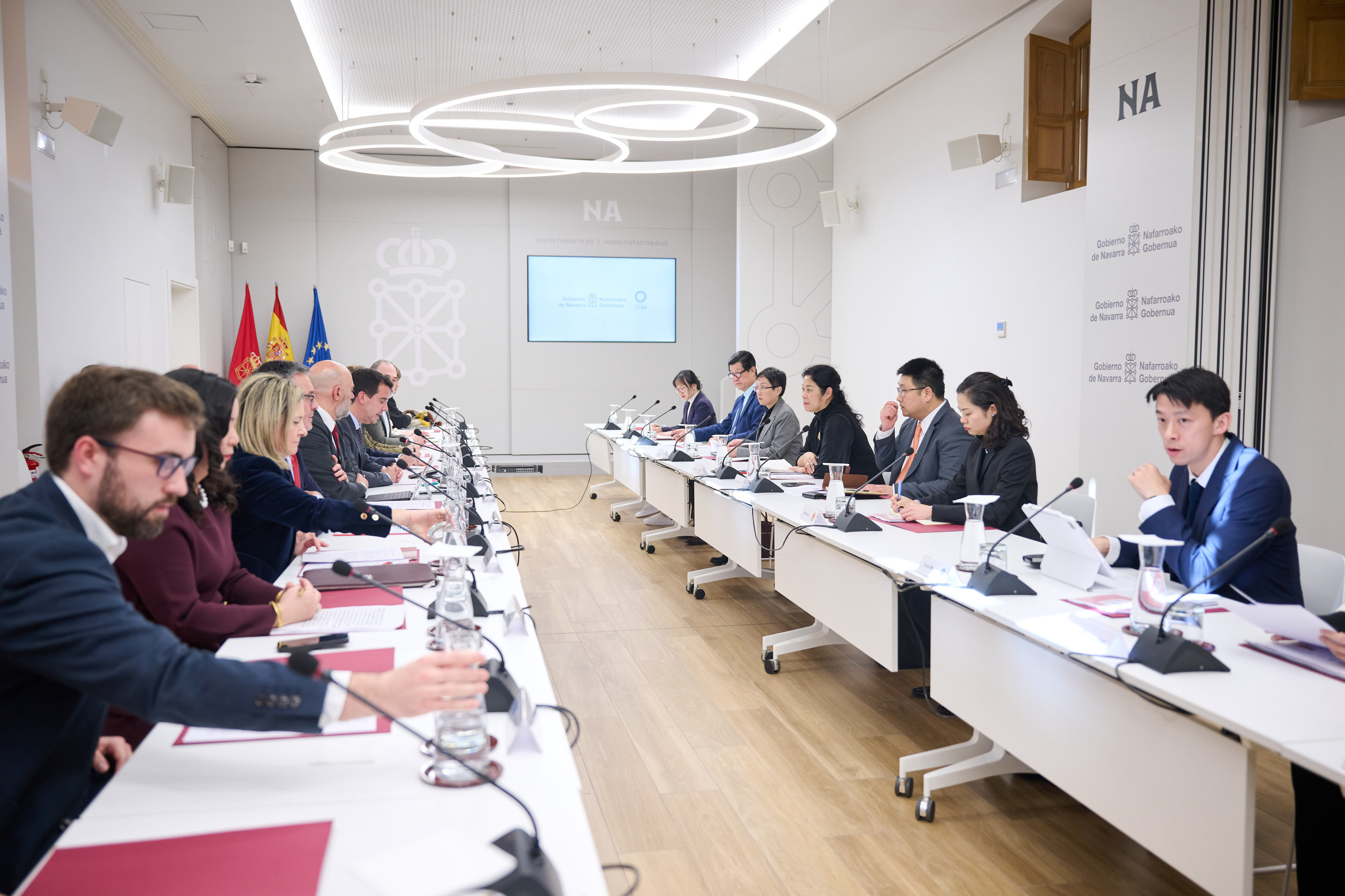 La Presidenta Chivite ha encabezado la recepción a la delegación del país asiático que ha estado formada por la consejera de Política de la Embajada de China, Tian, Geng; y el primer secretario de Comercio de la entidad Jiao, Yixian. Por parte del Gobierno de Navarra, han acudido los consejeros de Economía y Hacienda, José Luis Arasti; el de Industria y Transición Ecológica y Digital Empresarial, Mikel Irujo; y el de Universidad, Innovación y Transformación Digital, Juan Luis García.